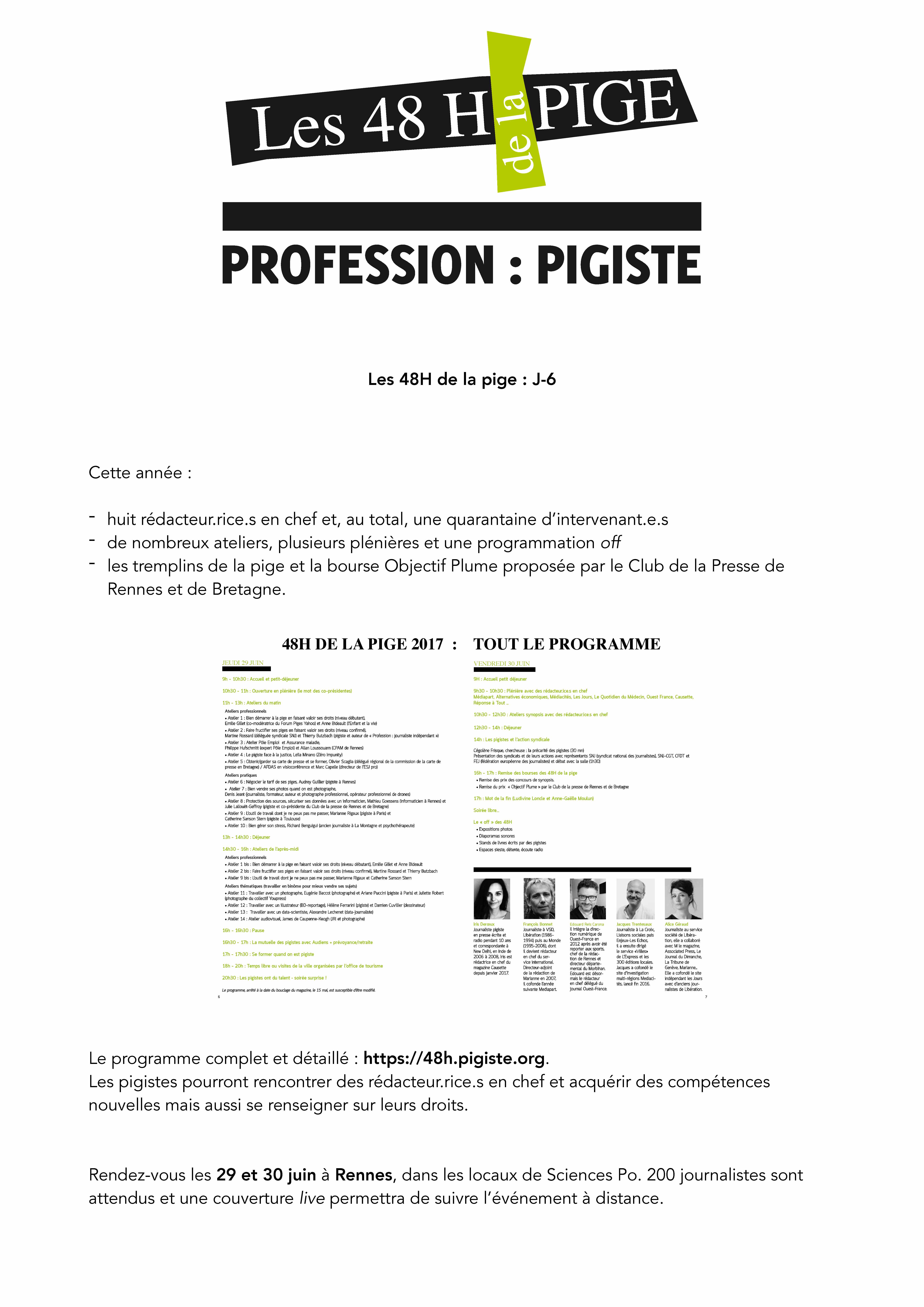 Pendant les prochaines 48H, les pigistes pourront rencontrer des rédacteur.rice.s en chef, acquérir de nouvelles compétences et s’informer sur les droits des pigistes. Le programme complet est en PJ. Ma collègue Bénédicte Weiss (weiss.benedicte@gmail.com) et moi-même (luff.marie@gmail.com) restons à votre disposition pour tout complément d’information. N’hésitez pas à relayer l’information auprès de vos adhérent.e.s. Marie Luff 06 50 19 31 lire la suite