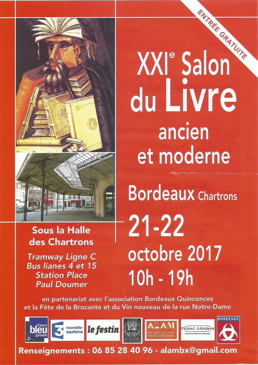 Bonjour, je vous adresse, en pièces jointes, les informations pour le prochain salon du livre ancien & moderne. La 21ème édition aura lieu le samedi 21 & dimanche 22 octobre 2017 sous la Halle des Chartrons à Bordeaux. Je vous souhaite bonne réception de ce mail, restant à votre disposition, en vous remerciant par avance d’en faire écho. Dans l’attente, bien cordialement. lire la suite
