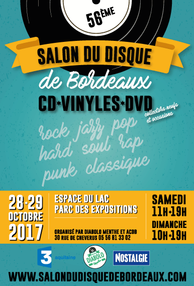 je vous adresse cette fois les informations concernant le 57 ème Salon du Disque de Bordeaux qui a lieu le week-end : du samedi 28 et dimanche 29 octobre 2017 au Parc des expositions de Bordeaux, à l’Espace du Lac.