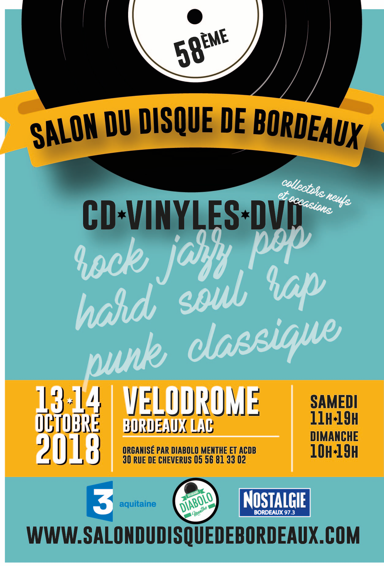 58ème SALON INTERNATIONAL DU DISQUE DE BORDEAUX AU VÉLODROME – PARC des EXPOSITIONS Samedi 13 & Dimanche 14 octobre 2018 Diabolo Menthe organise pour la 58ème édition le Salon du Disque. Ce salon, regroupant 80 exposants venus de toute la France et de l’étranger s’affiche comme la plus grande manifestation du Sud-Ouest dans sa spécialité. lire la suite
