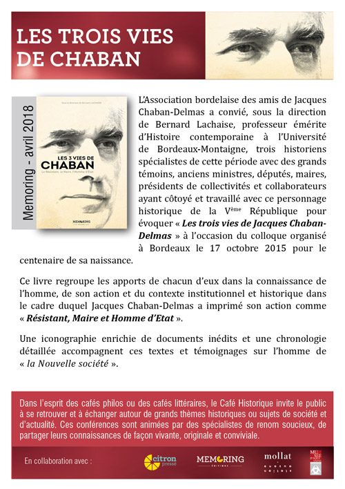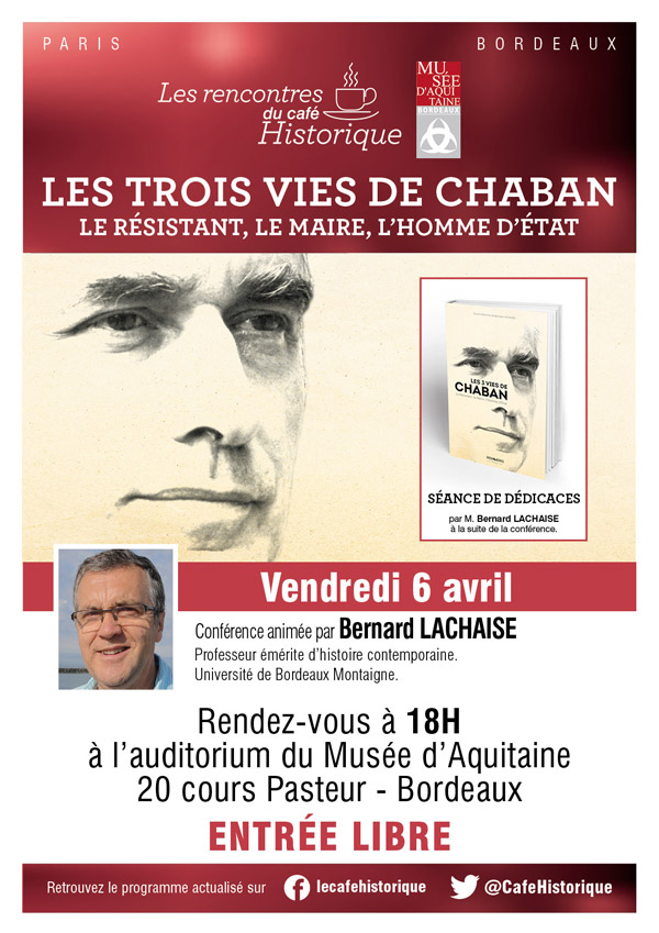 Le 6 avril nous aurons le plaisir de recevoir dans le cadre du Café Historique, à 18h à l’auditorium du Musée d’Aquitaine, M. Bernard LACHAISE pour une conférence sur le thème : LES TROIS VIES DE CHABAN à l’occasion de la sortie du livre retraçant la vie de ce personnage incontournable de notre histoire.