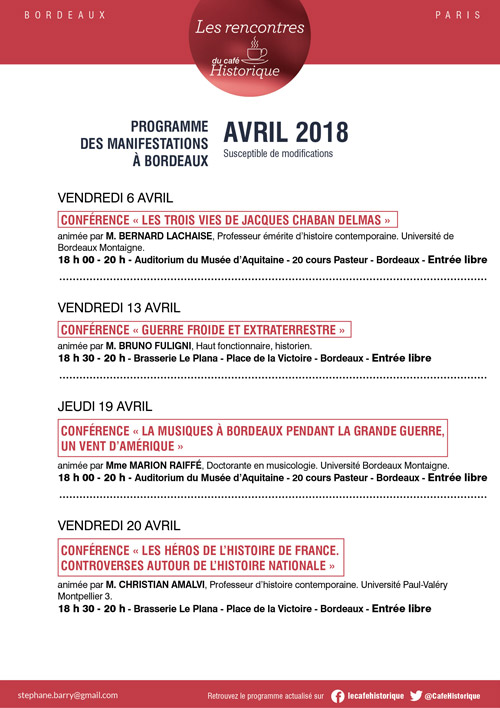 Mesdames, messieurs, chers (es) amis (es), Le 6 avril nous aurons le plaisir de recevoir dans le cadre du Café Historique, à 18h à l’auditorium du Musée d’Aquitaine, M. Bernard LACHAISE pour une conférence sur le thème : LES TROIS VIES DE CHABAN à l’occasion de la sortie du livre retraçant la vie de ce personnage incontournable de notre histoire. Cette conférence sera suivie d’une lire la suite