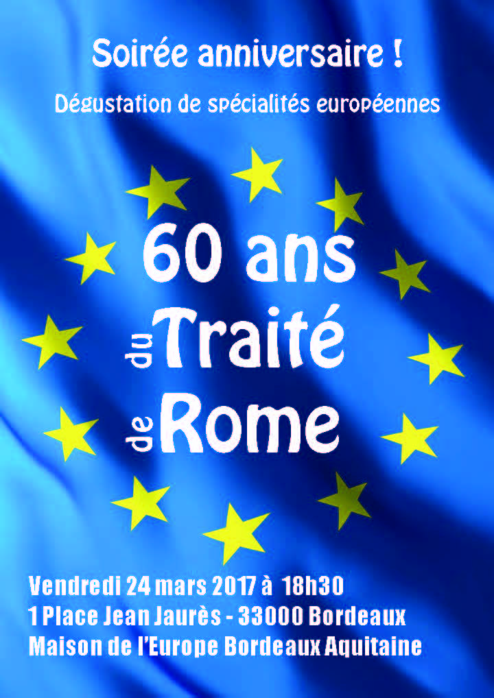 La Maison de l’Europe vous propose ce vendredi 24 mars à 18H30 un moment de convivialité et d’échanges pour fêter comme il se doit l’anniversaire d’un traité, qui permet encore aujourd’hui à 500 millions d’Européennes et d’Européens de vivre en paix, librement avec des institutions démocratiques.