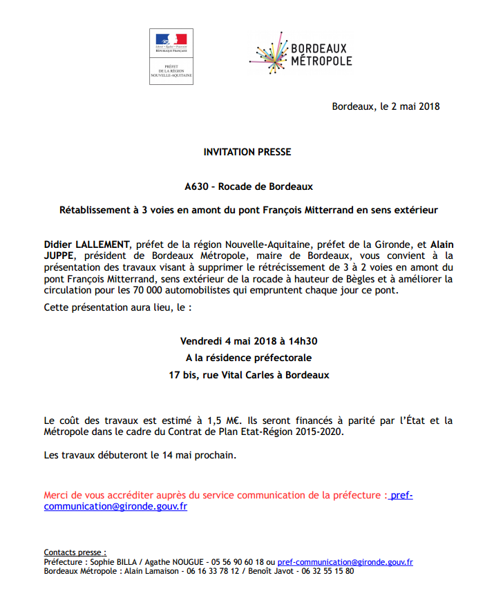 Accueil > Communiqués > A630 – Rocade de Bordeaux : rétablissement à 3 voies – point presse 04/05