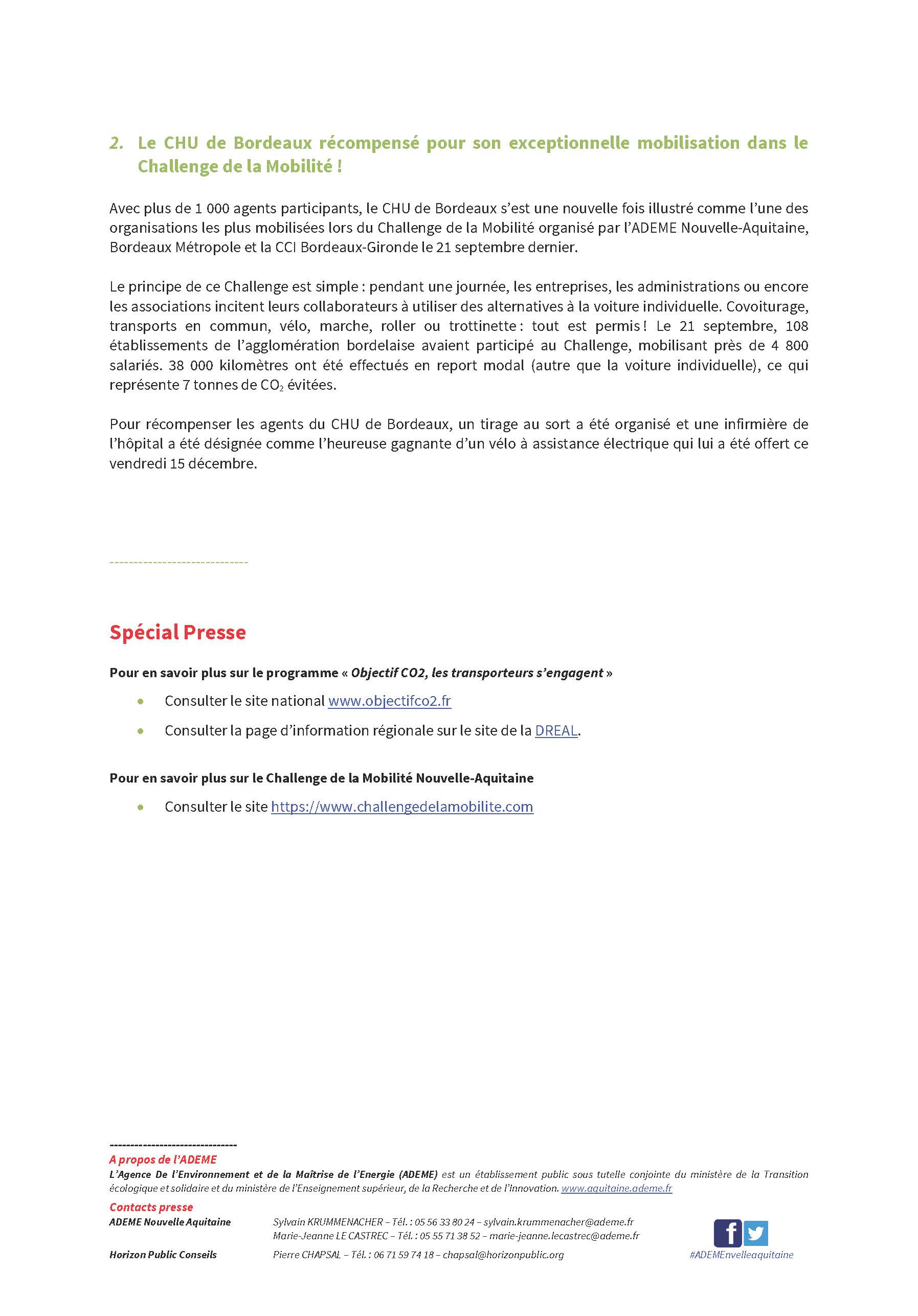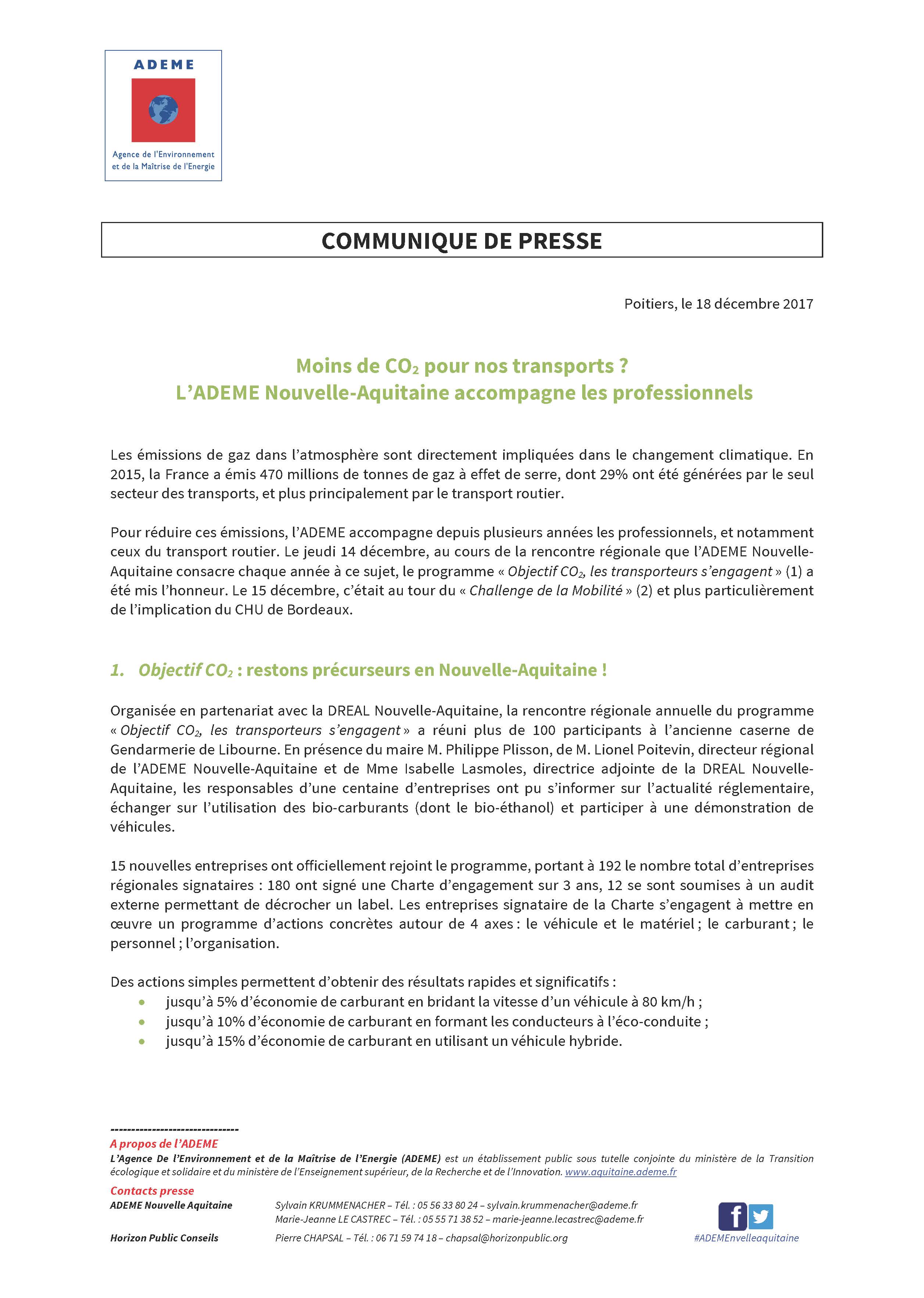 Madame, Monsieur, Nous avons le plaisir de vous transmettre ci-joint un communiqué de presse de l’ADEME Nouvelle-Aquitaine concernant la réduction des émissions de CO2 dans les transports et déplacements professionnels. Vous trouverez également des visuels illustrant : – le colloque organisé le 14 décembre sur la Charte CO2 proposée aux entreprises du transport routier lire la suite