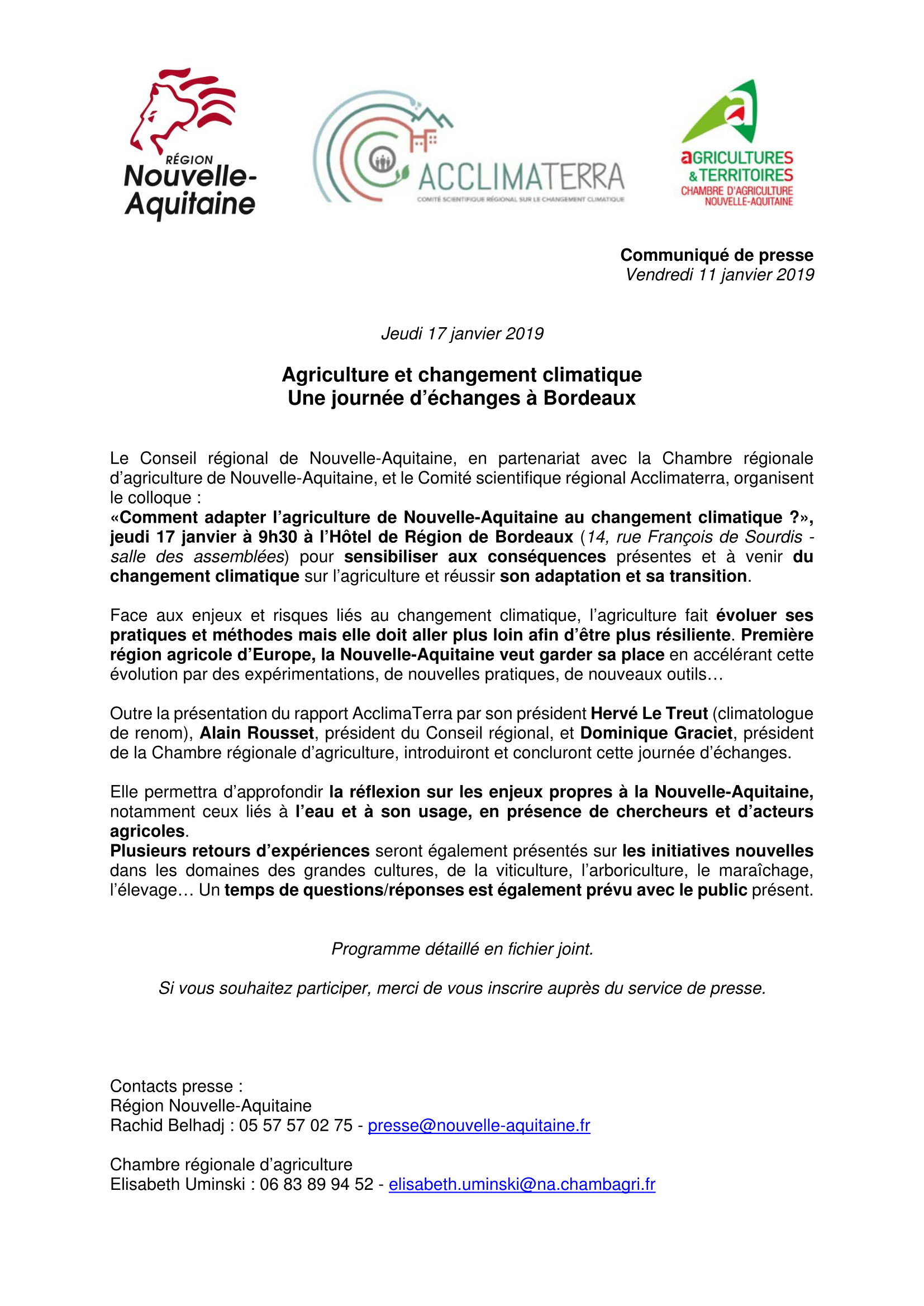 Communiqué en PDF : cp-acclimaterraagri-1701191 Programme en PDF : programme-colloqueagriacclimaterra-170119