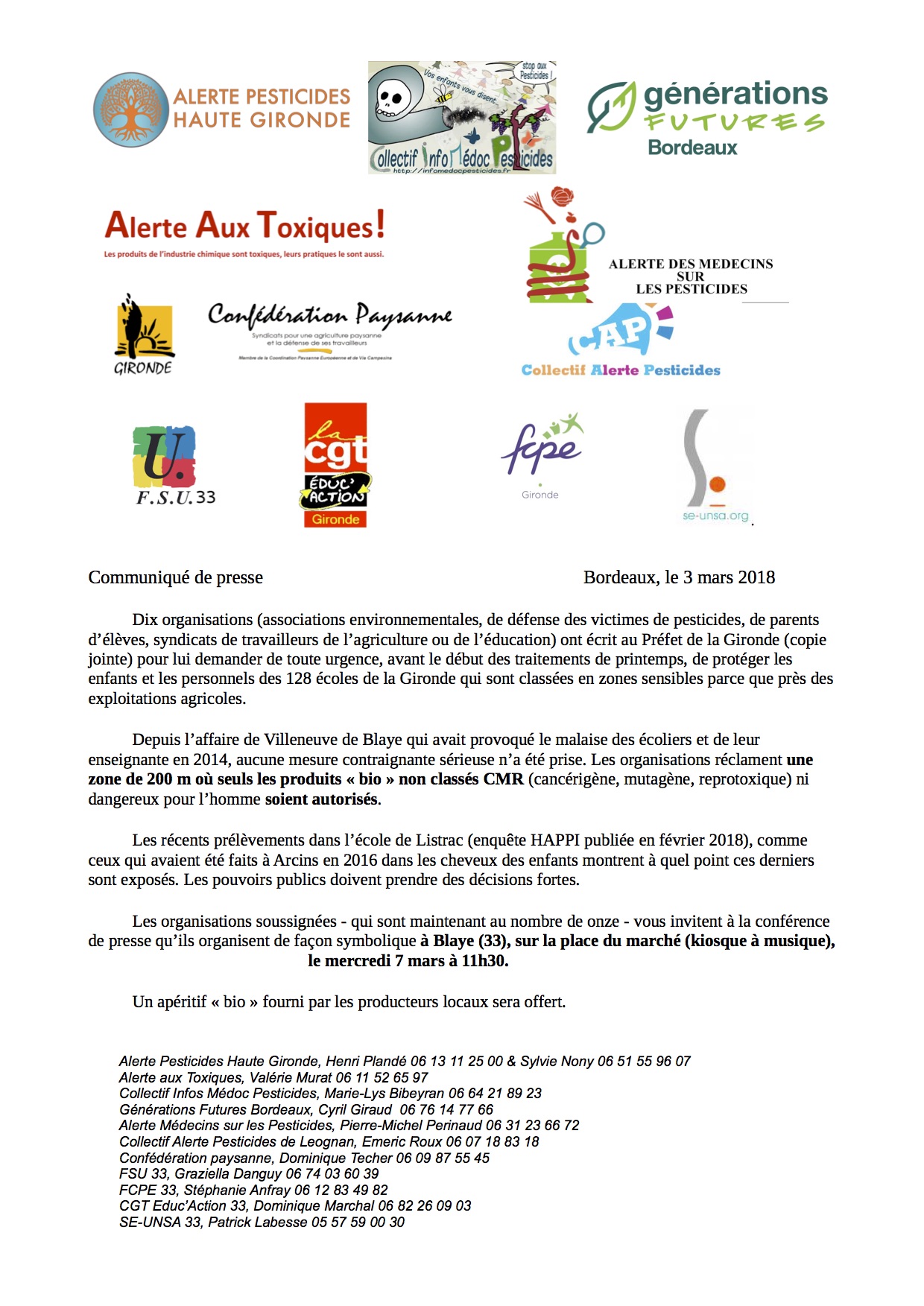 Communiqué de presse Dix organisations (associations environnementales, de défense des victimes de pesticides, de parents d’élèves, syndicats de travailleurs de l’agriculture ou de l’éducation) ont écrit au Préfet de la Gironde (copie jointe) pour lui demander de toute urgence, avant le début des traitements de printemps, de protéger les enfants des 128 écoles de la lire la suite