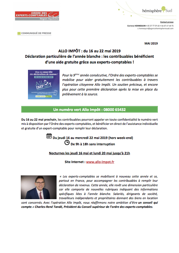Pour la 9ème année consécutive, l’Ordre des experts-comptables se mobilise pour aider gratuitement les contribuables à travers l’opération citoyenne Allo Impôt. Un soutien précieux, et encore plus pour cette première déclaration après la mise en place du prélèvement à la source.
