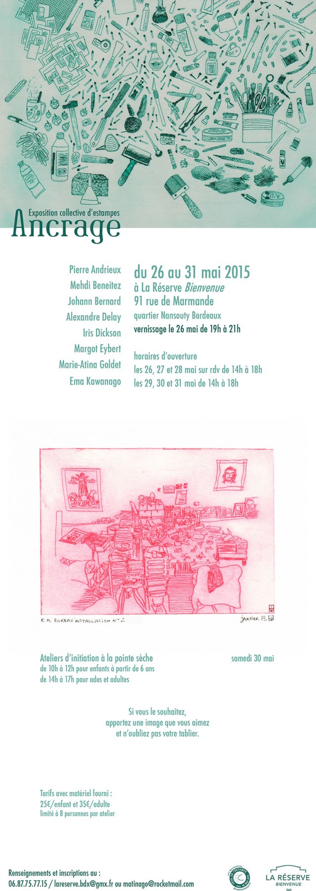 La Réserve est heureuse de vous inviter au vernissage de Ancrage, une exposition collective d’estampes proposée par Marie-Atina Goldet, l’une de ses habitantes. Mardi 26 mai 2015, à partir de 18h30 Le 26 mai, c’est la Fête de l’Estampe partout en France. A Bordeaux, Iris Dickson et Marie-Atina Goldet ont imaginé un parcours : bxestampe.wix.com/2015 lire la suite