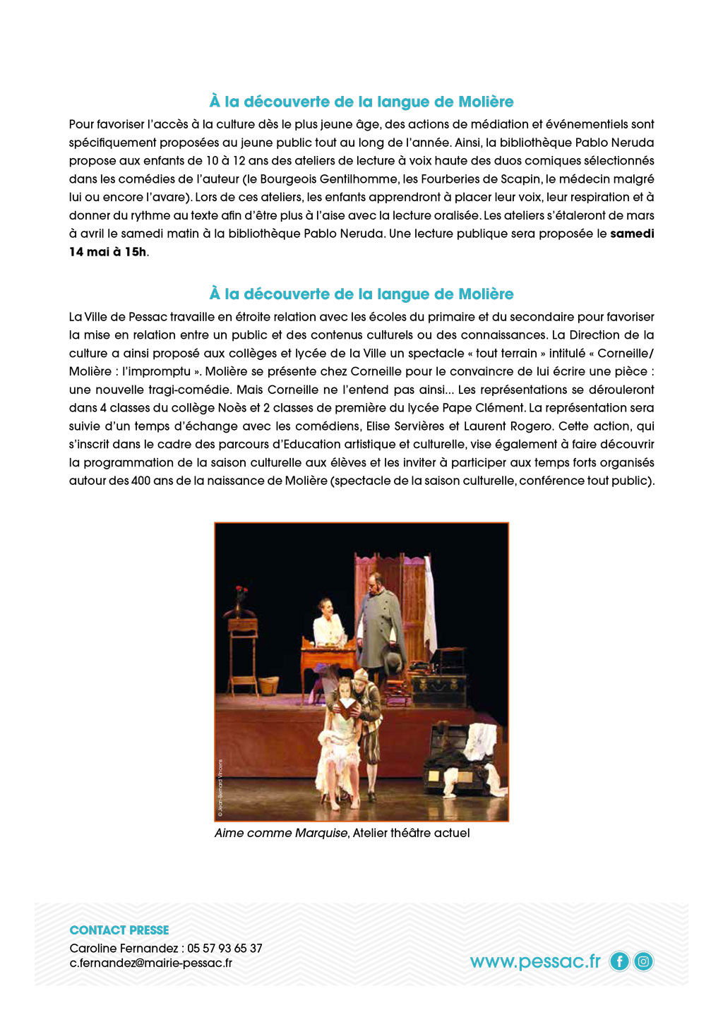 À l'occasion du 400e anniversaire de la naissance de Molière, la Ville de Pessac propose une riche programmation à destination de toute la famille pour découvrir, par le biais d'ateliers, de rencontres, de conférences et de spectacles, l'héritage du plus célèbre dramaturge français.