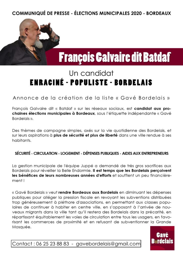 Communiqué de Presse annonçant la candidature de François Galvaire dit Batdaf aux élections municipales à Bordeaux.