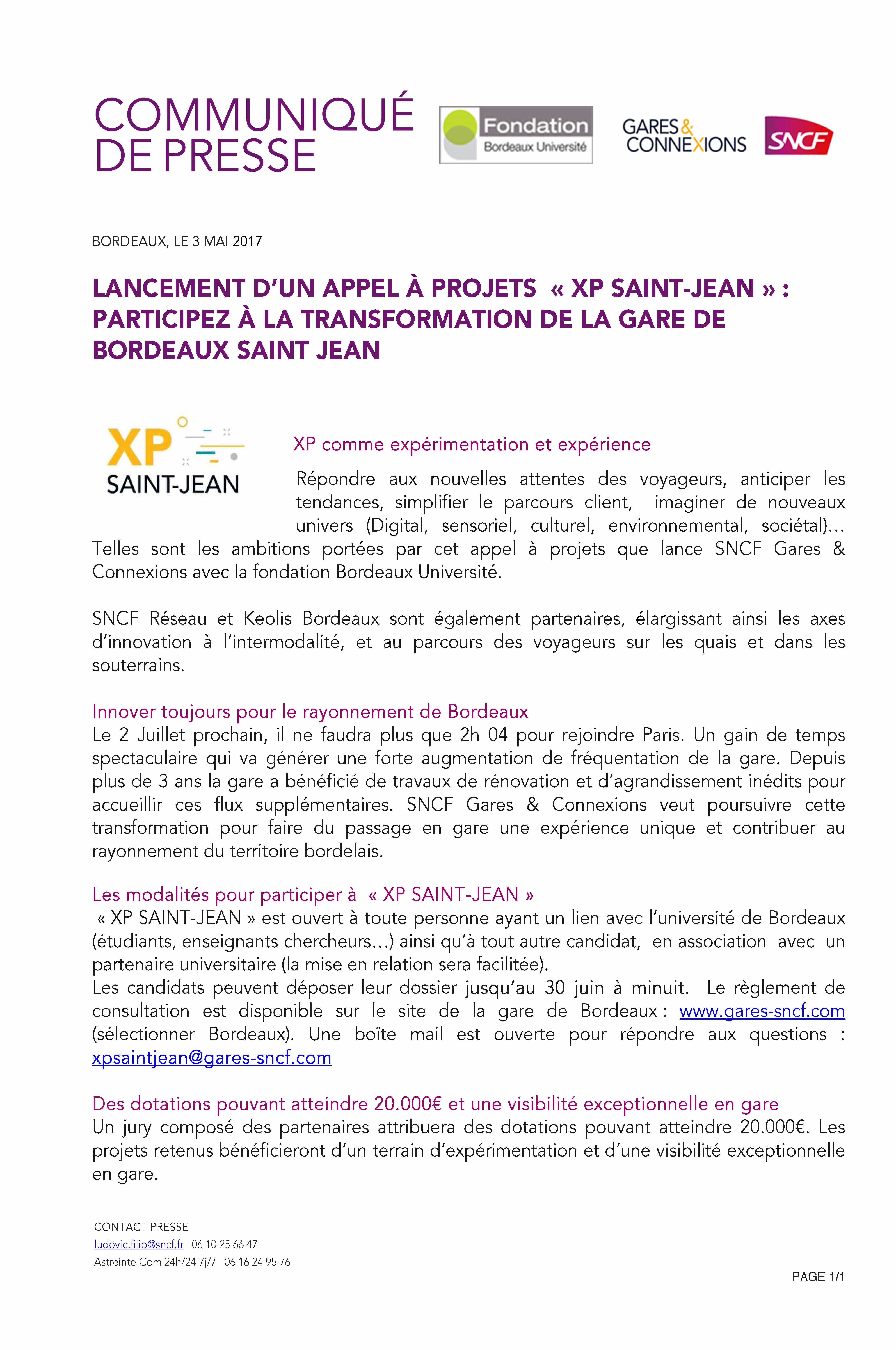 Veuillez trouver ci-joint le communiqué annonçant le lancement d’un appel à projets par Gares & Connexions pour imaginer les nouveaux univers de demain en gare de Bordeaux Saint-Jean (digital, sensoriel, etc.).