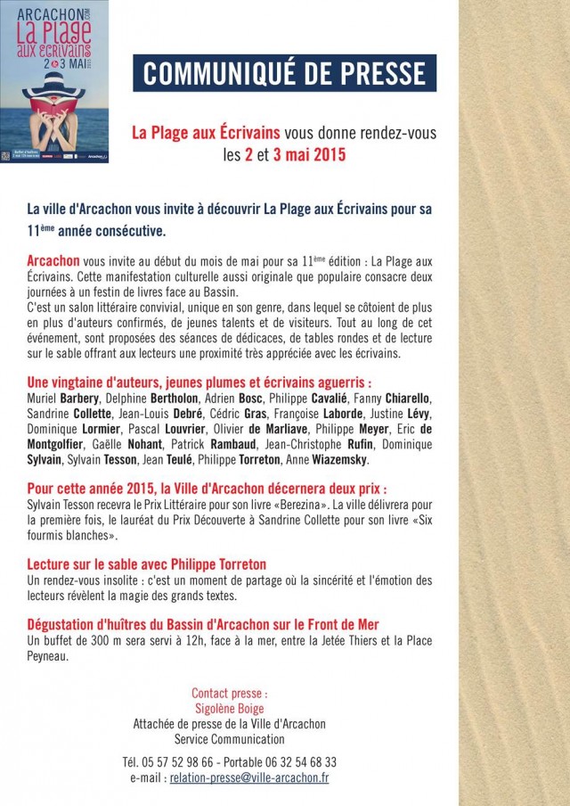 La Plage aux Ecrivains, aura lieu les 2 et 3 mai   Le jury du Prix de la Ville d’Arcachon, réuni le 12 mars à Paris, a désigné le lauréat 2015 : Sylvain Tesson pour « Berezina »   Nouveau, le Prix de la découverte à Sandrine Colette pour « Six fourmis blanches »     23 auteurs ont lire la suite
