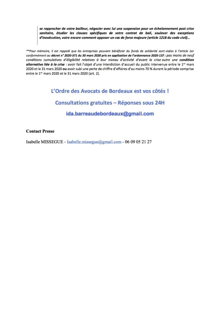 Mesdames, Messieurs, Je vous remercie de trouver ci-joints les CP. BARREAU SOLIDAIRE CP Loyers cciaux BARREAU SOLIDAIRE CP prévention risques Bonne réception,  — Isabelle Missègue Attachée de communication du Barreau de Bordeaux  06 09 05 21 27