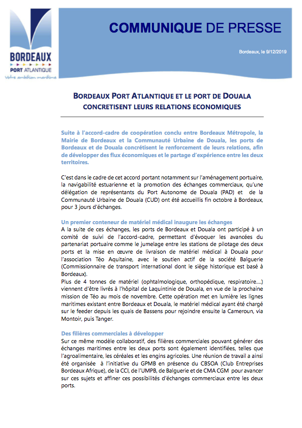 Communiqué relatif à la concrétisation des relations économiques entre Bordeaux Port Atlantique et le Port de Doual.