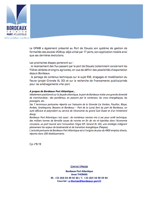 Communiqué relatif à la concrétisation des relations économiques entre Bordeaux Port Atlantique et le Port de Doual. Version pdf : 2019-07-09_Education_a_l_info