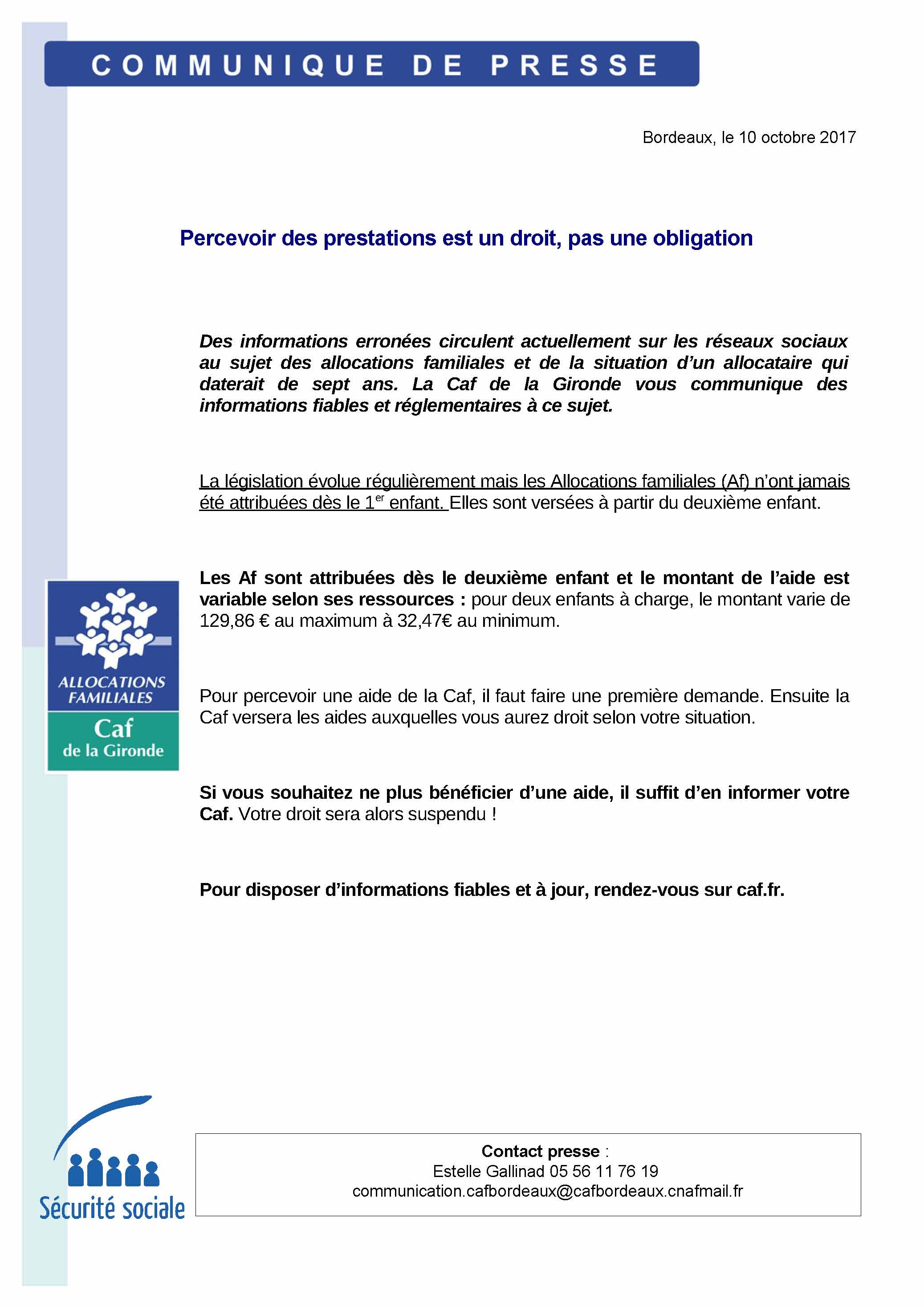 Bonjour, Depuis lundi 9 octobre, des informations erronées circulent sur les réseaux sociaux et dans la presse sur les Allocations familiales. La Caf de la Gironde vous communique des informations fiables à ce sujet. Vous trouverez plus de précisions dans le communiqué de presse ci-joint. Retrouvez tous nos communiqués de presse sur caf.fr. Cordialement Le lire la suite