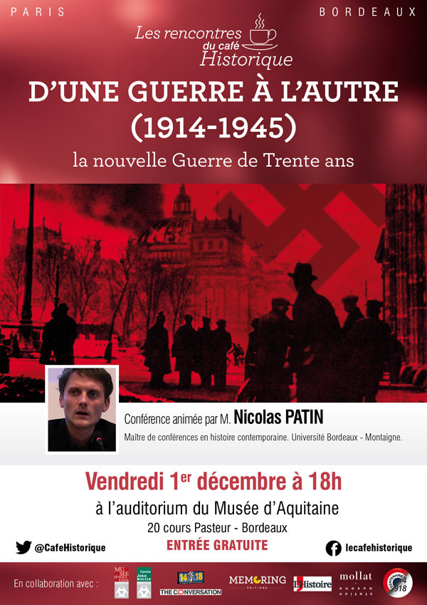 Mesdames, messieurs, chers (es) amis (es), Je suis très heureux de vous inviter aux prochaines manifestions du Café historique en partenariat avec le musée d’Aquitaine. 1/ Le 1er décembre dans le cadre du cycle de conférences sur la Grande Guerre, nous accueillerons M. Nicolas Patin, maître de conférences en histoire contemporaine à l’université Bordeaux Montaigne pour la conférence suivante lire la suite