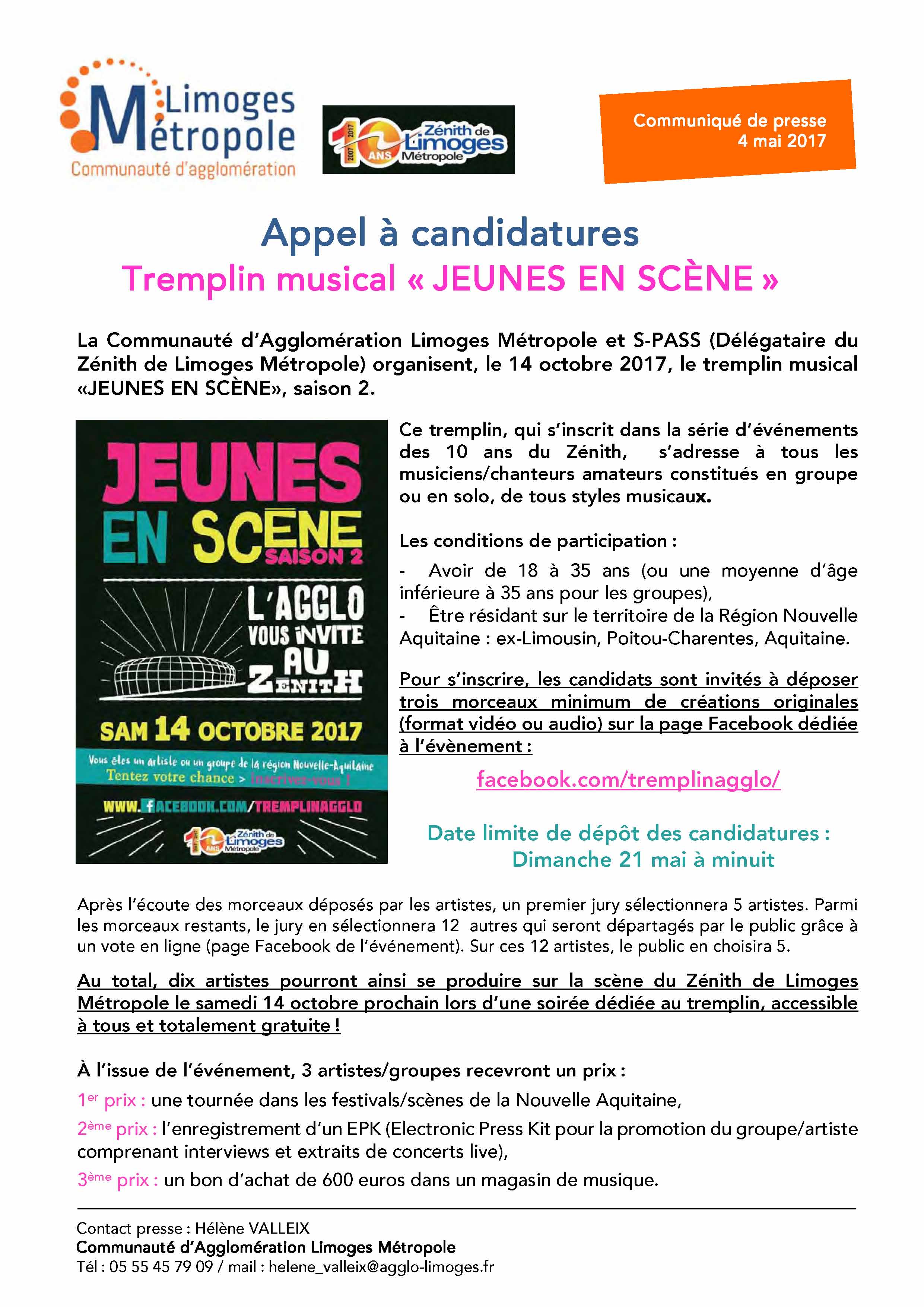 LIMOGES METROPOLE : Communiqué presse – Candidatures pour le tremplin musical JEUNES EN SCENE au Zénith de Limoges Métropole – jusqu’au 21 mai 2017