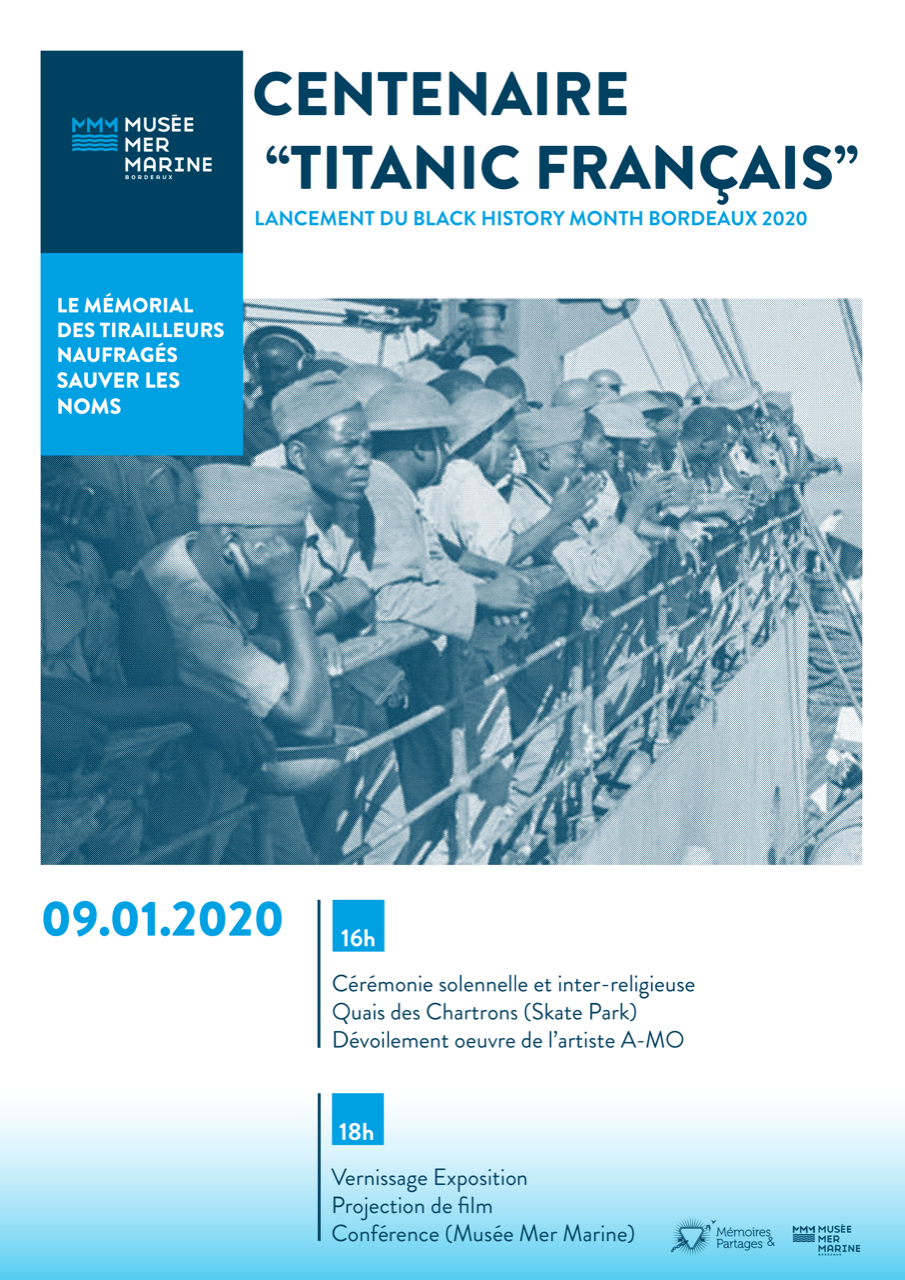 A l’occasion des manifestations célébrant le Centenaire de ce naufrage du « Titanic Français », l’association Mémoires & Partages, avec le soutien de plusieurs partenaires institutionnels et associatifs, organise plusieurs événements pour rendre hommage aux victimes et réhabiliter le sacrifice des tirailleurs sénégalais naufragés.