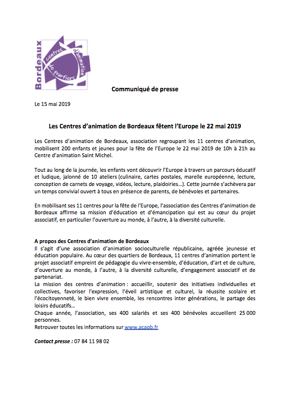 Accueil > Communiqués > Les Centres d’animation de Bordeaux fêtent l’Europe le 22 mai 2019