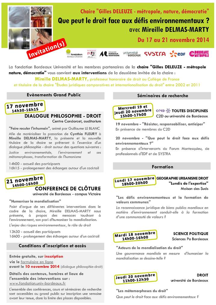 La chaire « chaire « Gilles Deleuze – métropole, nature, démocratie » organise une semaine de réflexion et d’échanges du 17 au 21 novembre, en présence de Mireille DELMAS-MARTY, professeur honoraire de droit au Collège de France. Cette dernière partagera sa vision des questions posées par le concept de justice environnementale, dans le prolongement des réflexions engagées par lire la suite