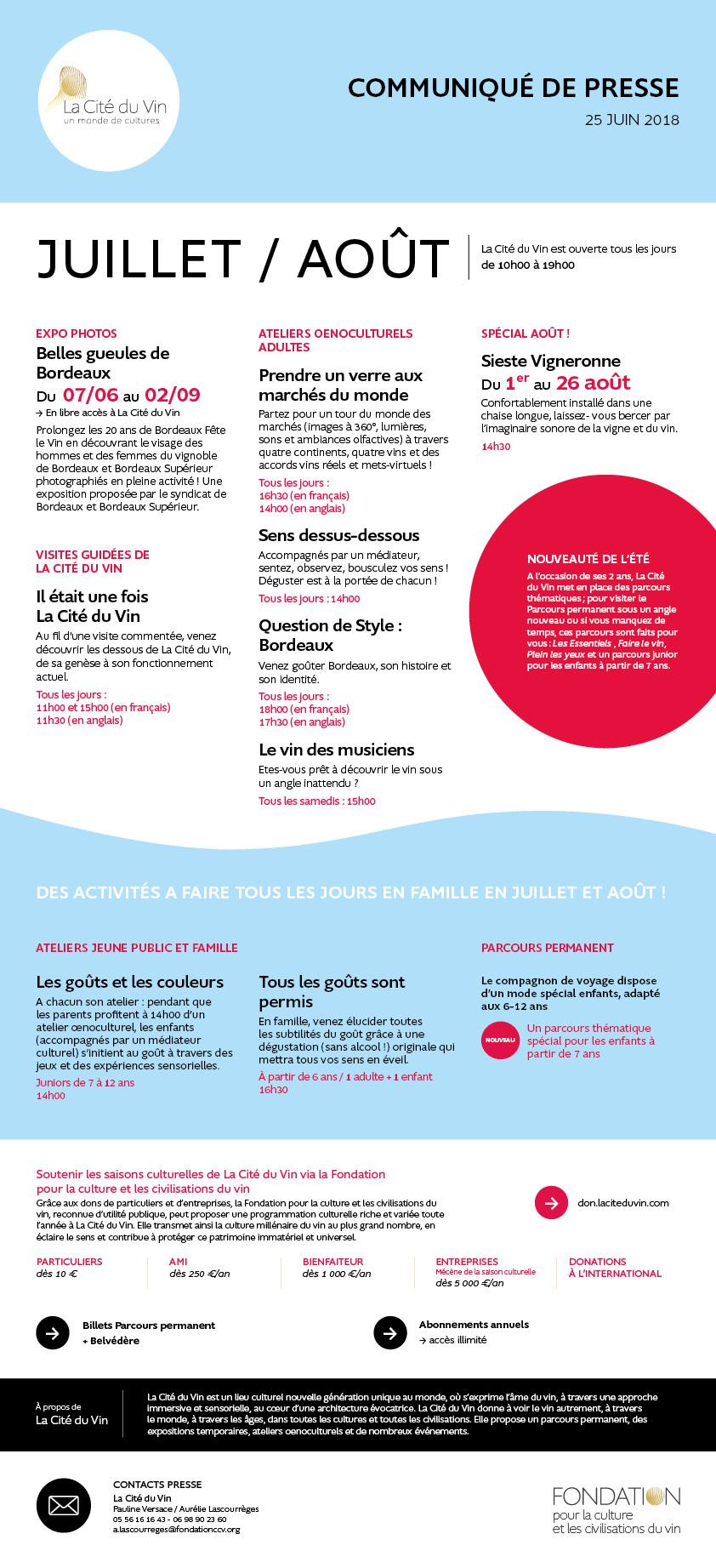 Durant tout l’été, une sélection variée d’animations attend les visiteurs à La Cité du Vin ! Des ateliers oenoculturels pour tous les goûts (pour petits et grands), des visites guidées ou encore des siestes vigneronnes tandis que le Parcours permanent se découvre sous de nouveaux angles grâce à 4 parcours thématiques.