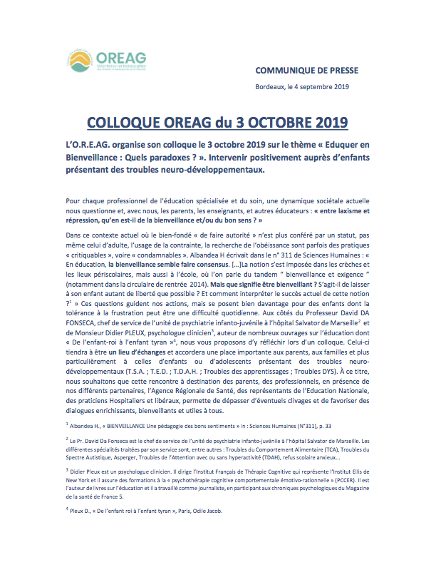 Communiqué de presse présentant le Colloque OREAG du 3 octobre 2019, à Bordeaux.