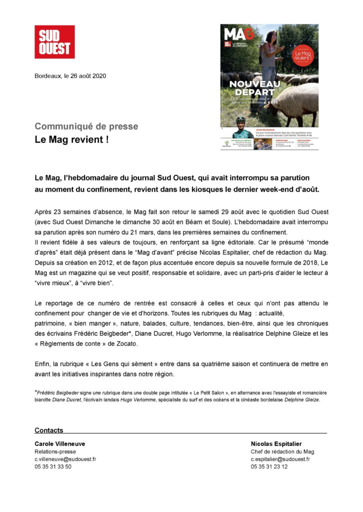CP à télécharger en pdf : Communiqué SUD OUEST Le Mag revient