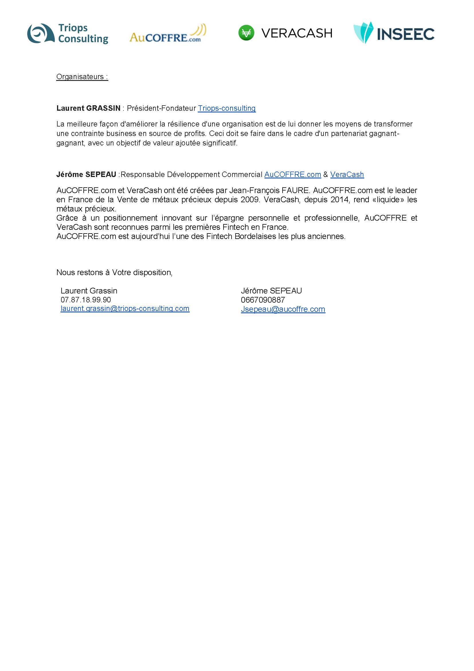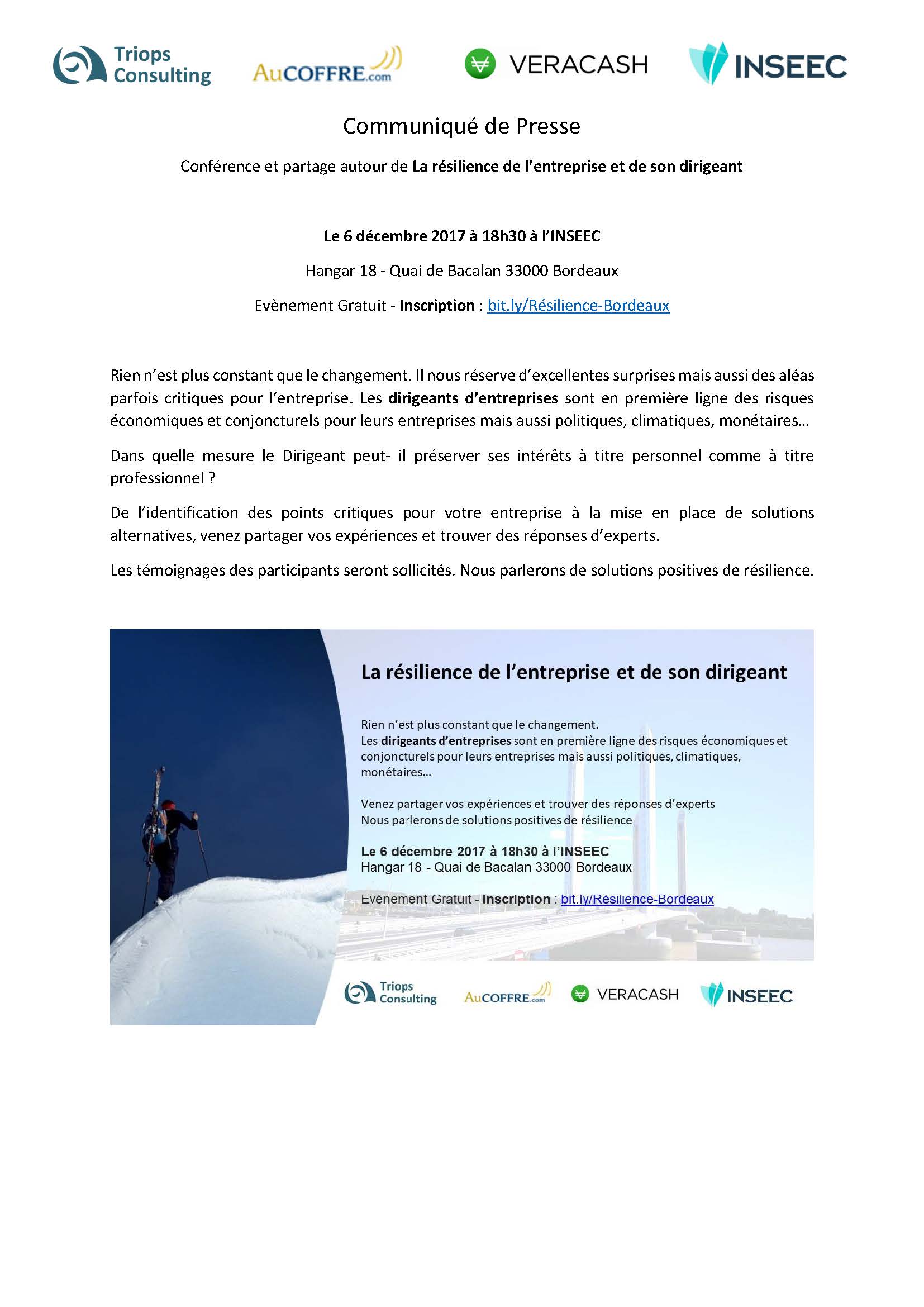Le 6 décembre 2017 à 18h30 à l’INSEEC Hangar 18 – Quai de Bacalan 33000 Bordeaux Evènement Gratuit – Inscription : bit.ly/Résilience-Bordeaux Rien n’est plus constant que le changement. Il nous réserve d’excellentes surprises mais aussi des aléas parfois critiques pour l’entreprise. Les dirigeants d’entreprises sont en première ligne des risques économiques et conjoncturels pour lire la suite