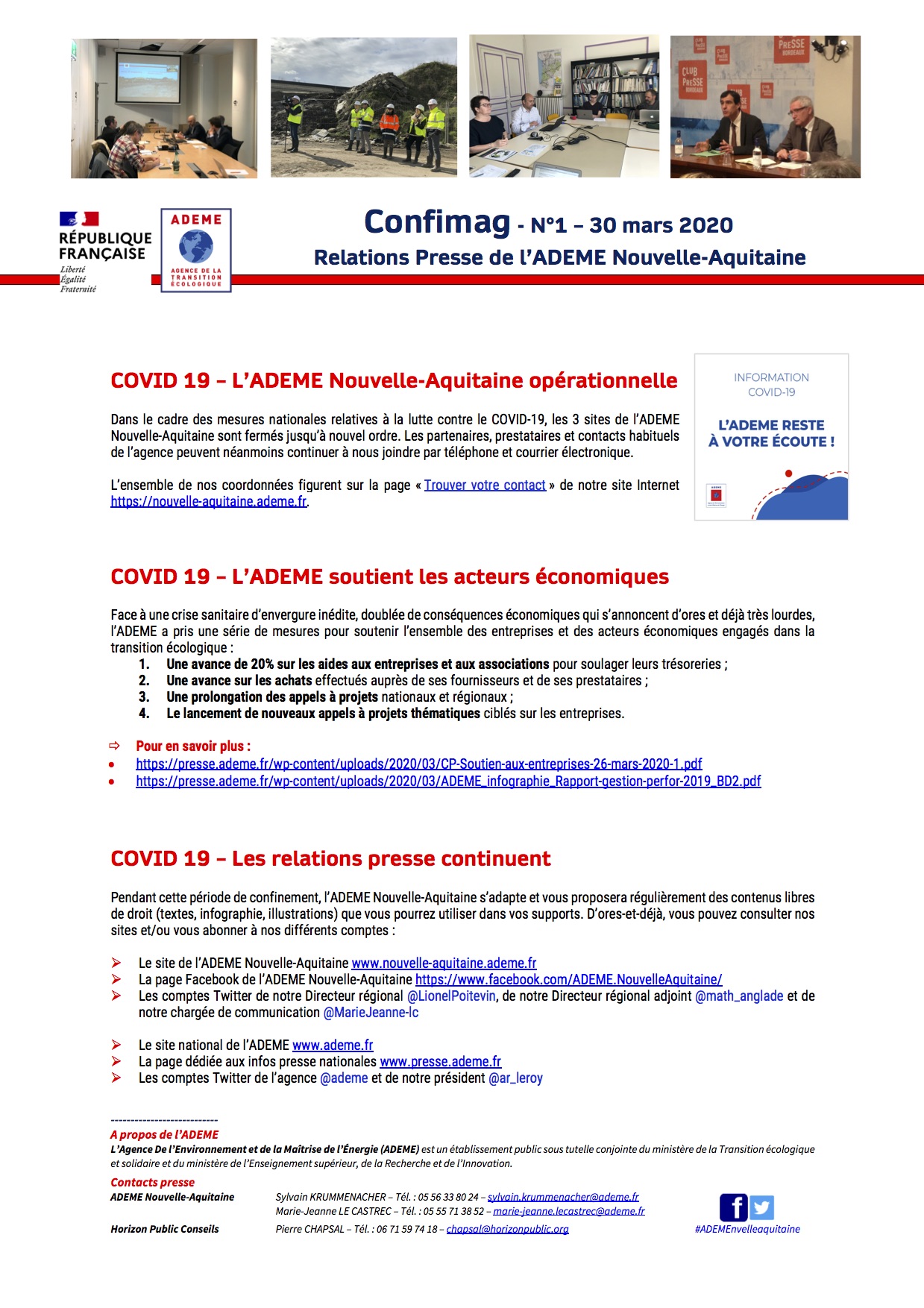 Madame, Monsieur, Nous avons le plaisir de vous adresser le 1er CONFIMAG de l’ADEME Nouvelle-Aquitaine, un nouvel outil spécialement produit pour conserver le lien avec les professionnels de la presse et des médias pendant la période de confinement. Deux sujets seront prochainement traités : les 10 bons gestes numériques en télétravail ; une opération ludique de science lire la suite
