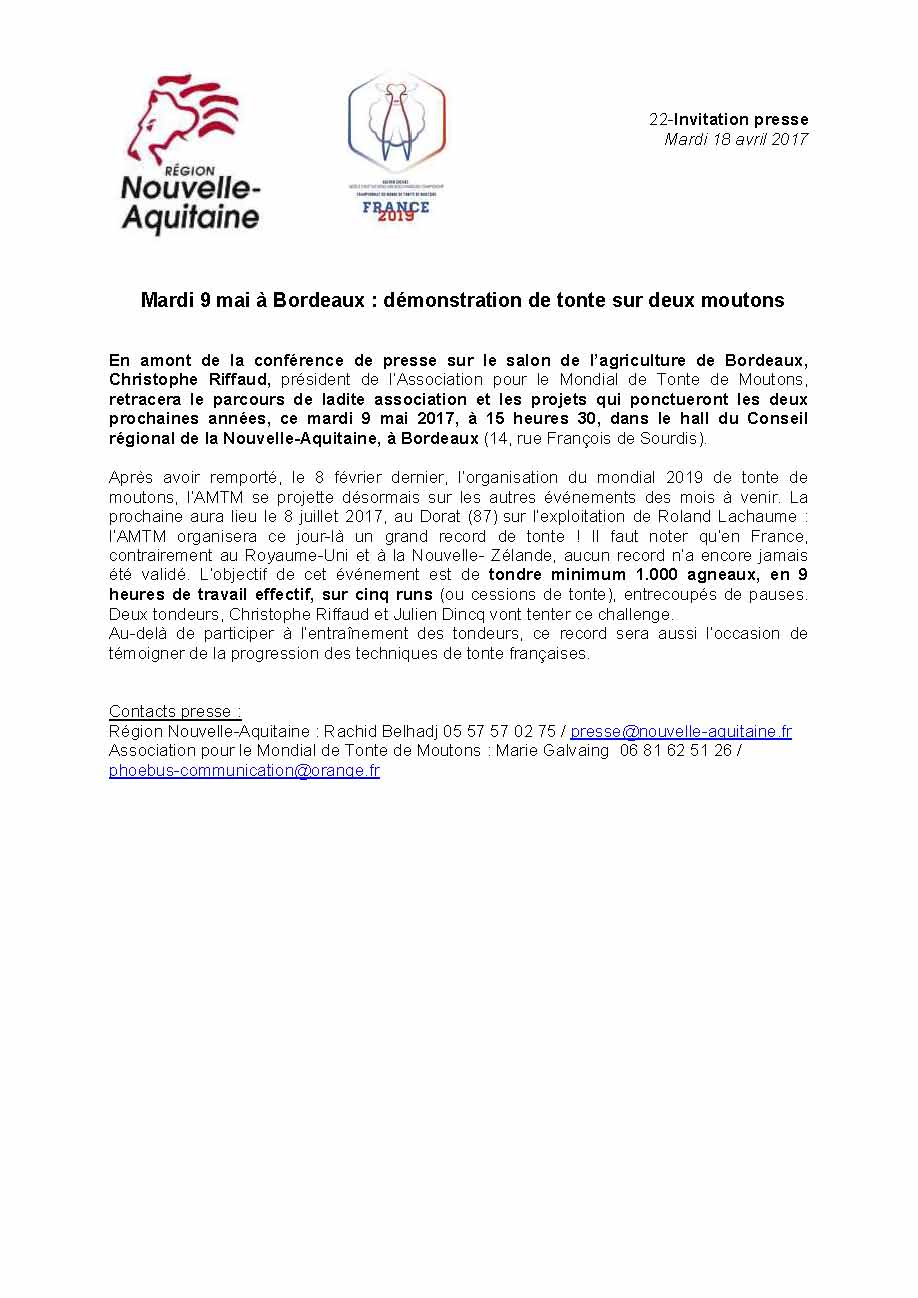 COMMUNIQUE DE PRESSE : Mardi 9 mai à Bordeaux : démonstration de tonte sur deux moutons En amont de la conférence de presse sur le salon de l’agriculture de Bordeaux, Christophe Riffaud, président de l’Association pour le Mondial de Tonte de Moutons, retracera le parcours de ladite association et les projets qui ponctueront les deux prochaines lire la suite