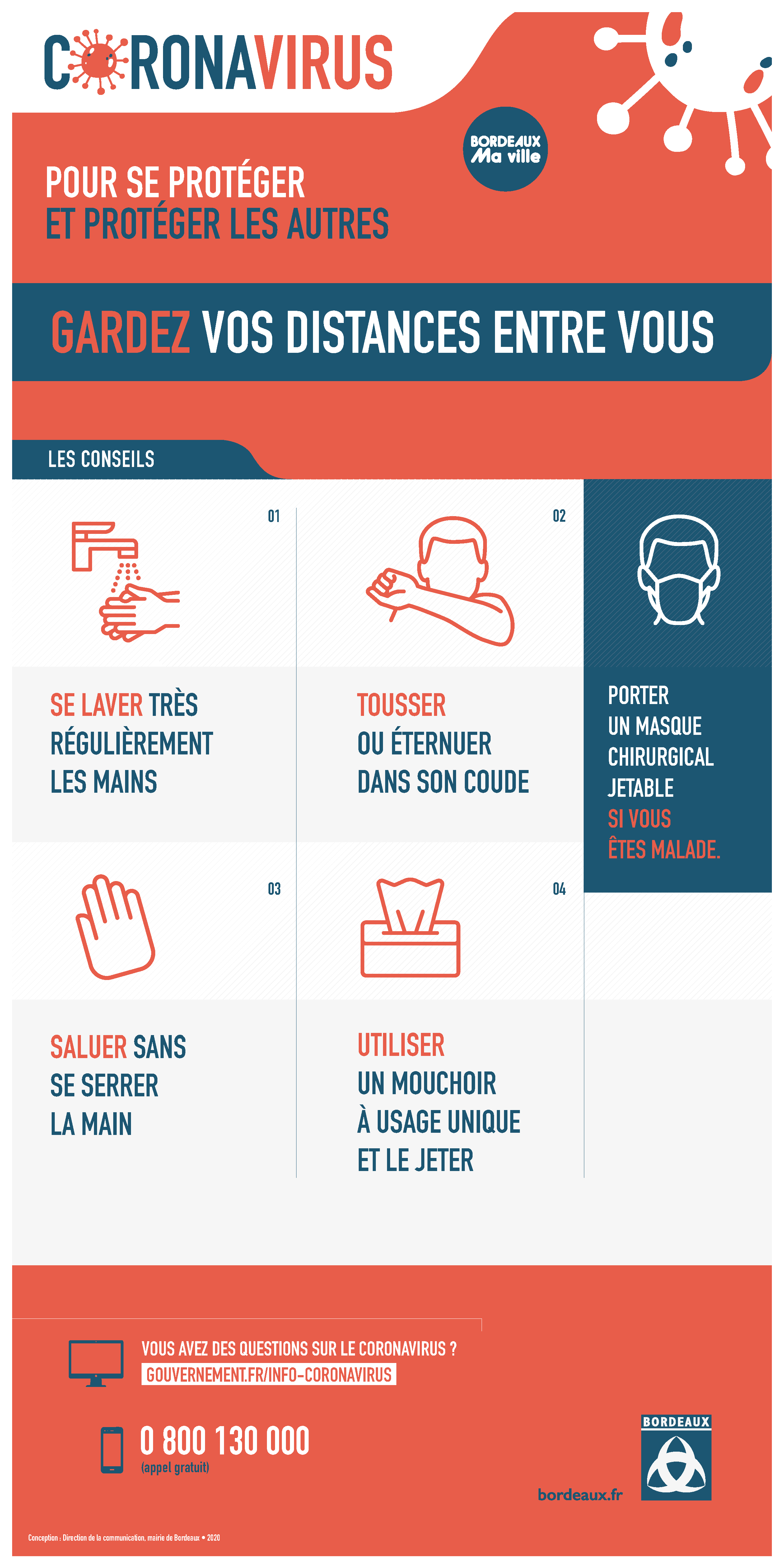 A tout moment, retrouvez sur le site officiel de la Ville bordeaux.fr des informations actualisées sur la progression du virus, les consignes et recommandations pour se protéger et protéger les autres.