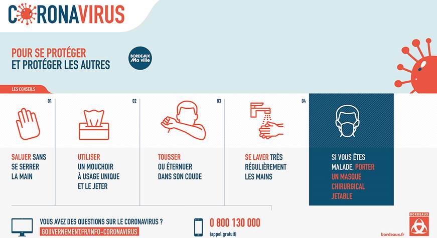 La Ville rappelle que le respect des « gestes barrières » reste essentiel, principalement le lavage fréquent des mains. Pour toute question sur le Coronavirus autre que médicale, le 0 800 130 000 est le 1er réflexe. En cas de suspicion sur sa santé ou celle d’un proche, ne pas se déplacer, appeler le 15.