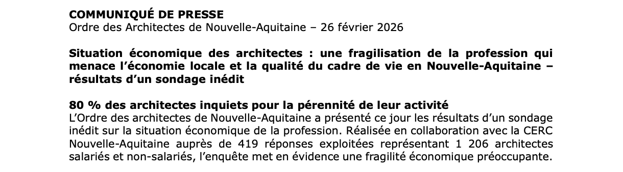 Situation économique des architectes : une fragilisation de la profession qui menace l’économie locale et la qualité du cadre de vie en Nouvelle-Aquitaine – résultats d’un sondage inédit