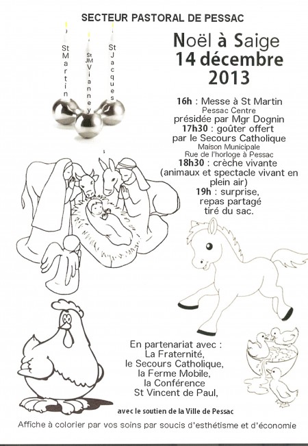 18 h 30 : Crèche Vivante (animaux et spectacle vivant en plein air) près de la Maison de Quartier de Saige rue de l’Horloge