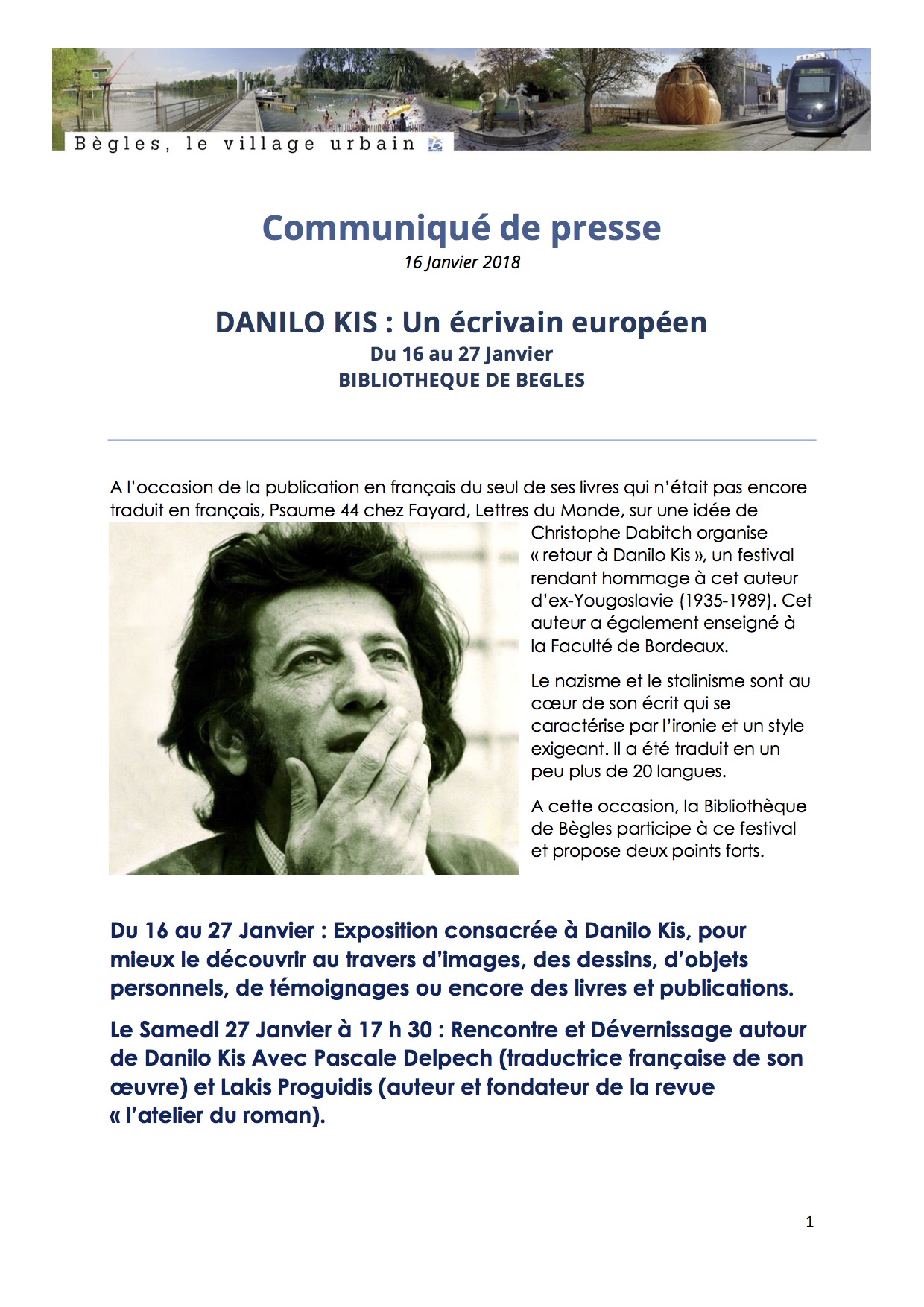 Accueil > Communiqués > Danilo KIS à la Bibliothèque de Bègles
