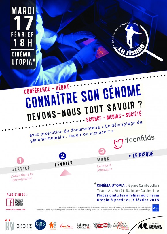 Le mardi 17 février à 18h au cinéma Utopia à Bordeaux (5 Place Camille Jullian), la conférence « Connaître son génome : devons-nous tout savoir ? » portera sur les risques liés au séquençage du génome humain. Elle sera introduite par la projection du documentaire américain « Le décryptage du génome humain : espoir ou menace ? » (2012, 53 min).