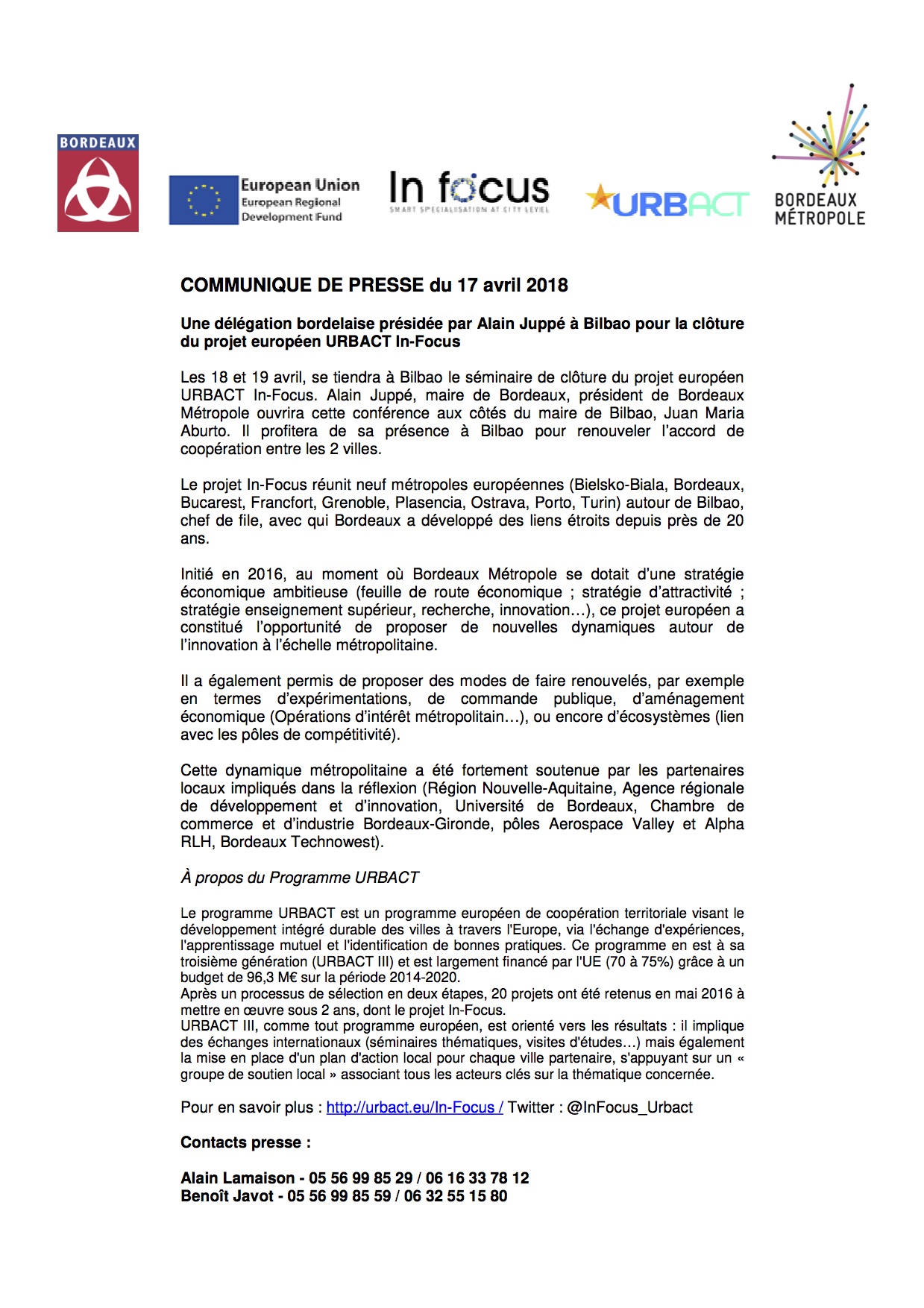 Accueil > Communiqués > Une délégation bordelaise présidée par Alain Juppé à Bilbao pour la clôture du projet européen URBACT In-Focus