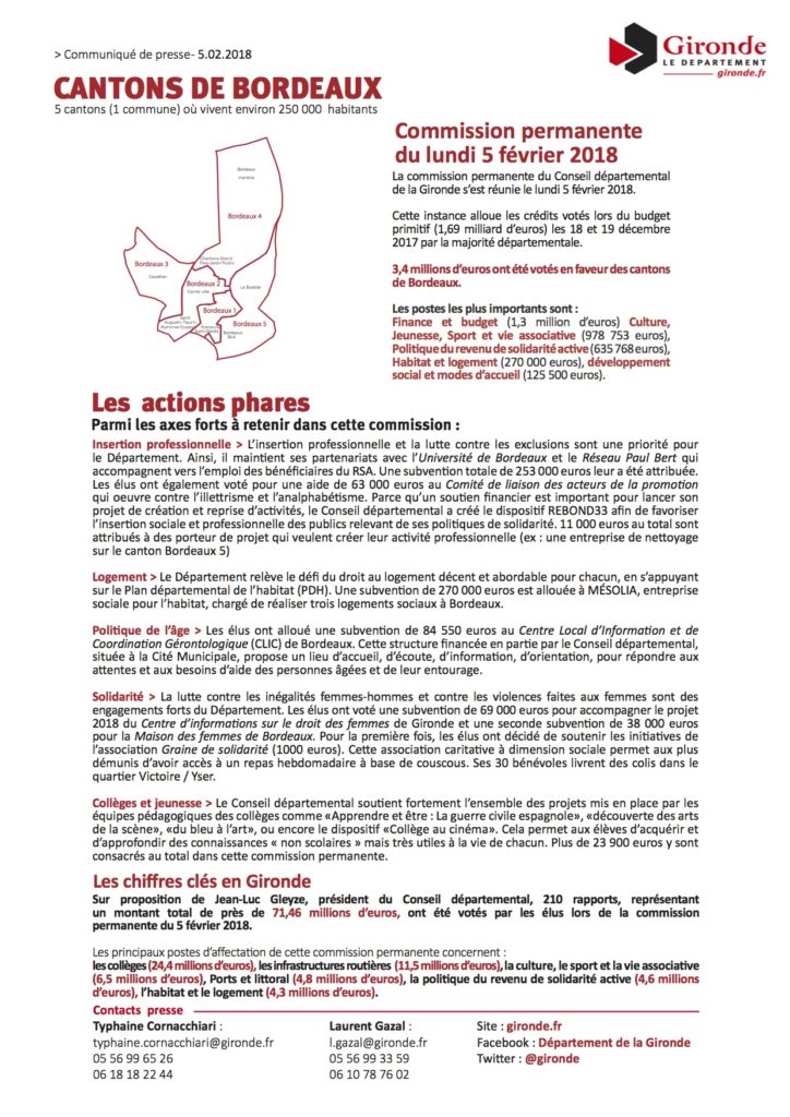 Cantons de Bordeaux Insertion, logement, personnes âgées, le Département aux cotés des bordelais les plus vulnérables. La commission permanente du Conseil départemental de la Gironde s’est réunie le lundi 5 février 2018. Cette instance alloue les crédits votés lors du budget primitif (1,69 milliard d’euros) les 18 et 19 décembre 2017 par la majorité départementale. lire la suite