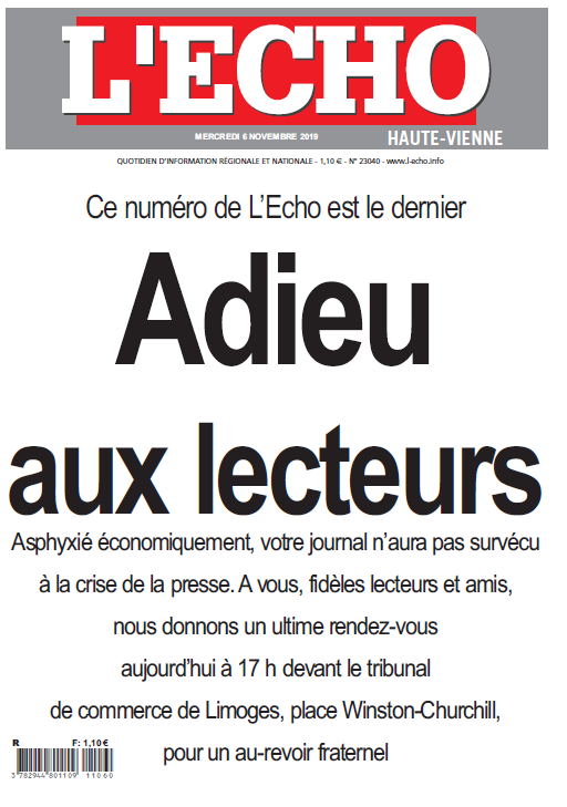 « Ce numéro de L’Echo est le dernier. Adieu aux lecteurs. » La une de ce jour du quotidien régional L’Echo, aux allures de faire-part de décès, annonce : « Asphyxié économiquement, votre journal n’aura pas survécu à la crise de la presse. A vous, fidèles lecteurs et amis, nous donnons un ultime rendez-vous aujourd’hui à 17 h devant le tribunal de commerce de Limoges, place Winston-Churchill, pour un au-revoir fraternel. »
