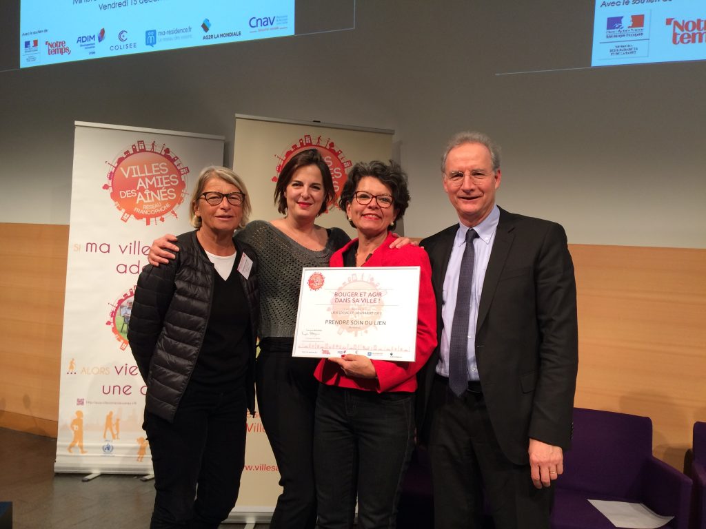 Vendredi 15 décembre 2017 à Paris, au Ministère des Solidarités et de la Santé, en présence de la Ministre, Madame Agnès Buzyn, la Mobil’Aînés® a reçu le «Prix Lien Social et Solidarité », l’une des 8 thématiques du concours « Bouger et agir dans sa ville », du Réseau Francophone Villes Amies des Aînés (RFVAA). La Mobil’Aînés® est une marche en rolateurs (déambulateurs à roulettes) en binômes intergénérationnels organisée par l’Association Prendre Soin du Lien.