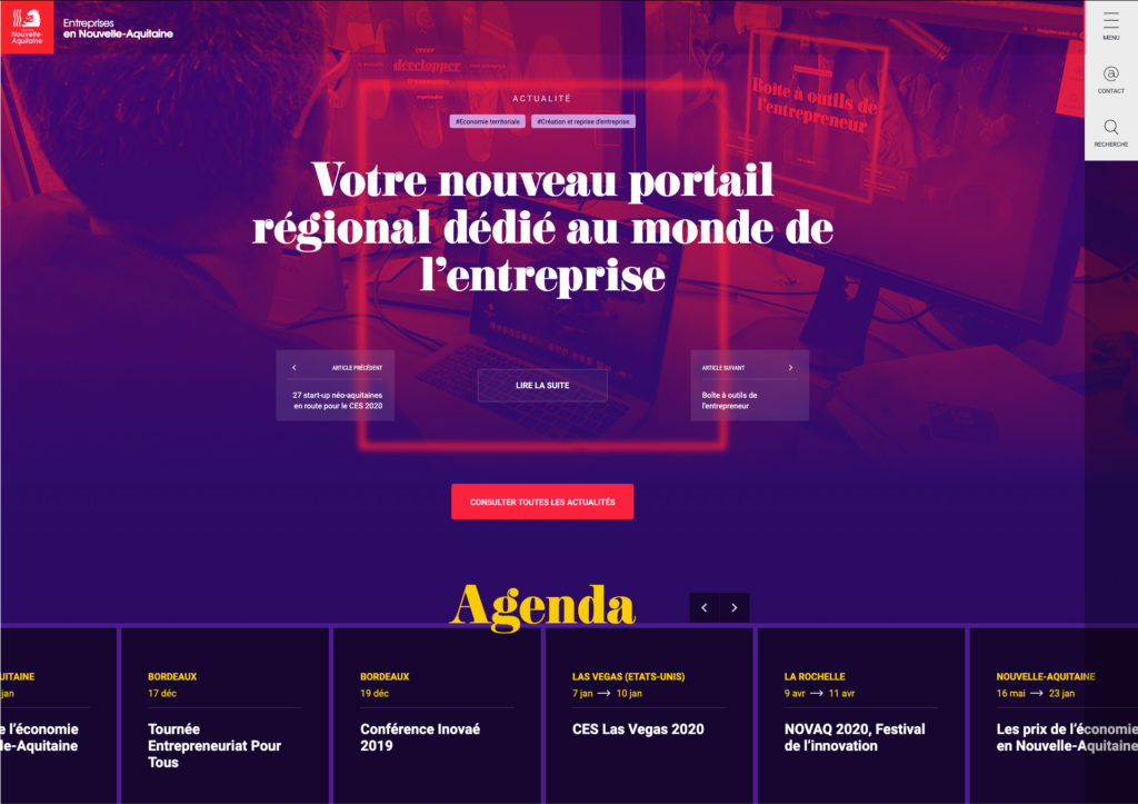 Chef de file du développement économique, la Région Nouvelle-Aquitaine a mis en ligne ce 10 décembre 2019, ce site portail dédié à l’entreprise. Il valorise la politique de la Région en matière de développement économique et propose des services et informations pratiques autour de divers parcours de l’entreprise.