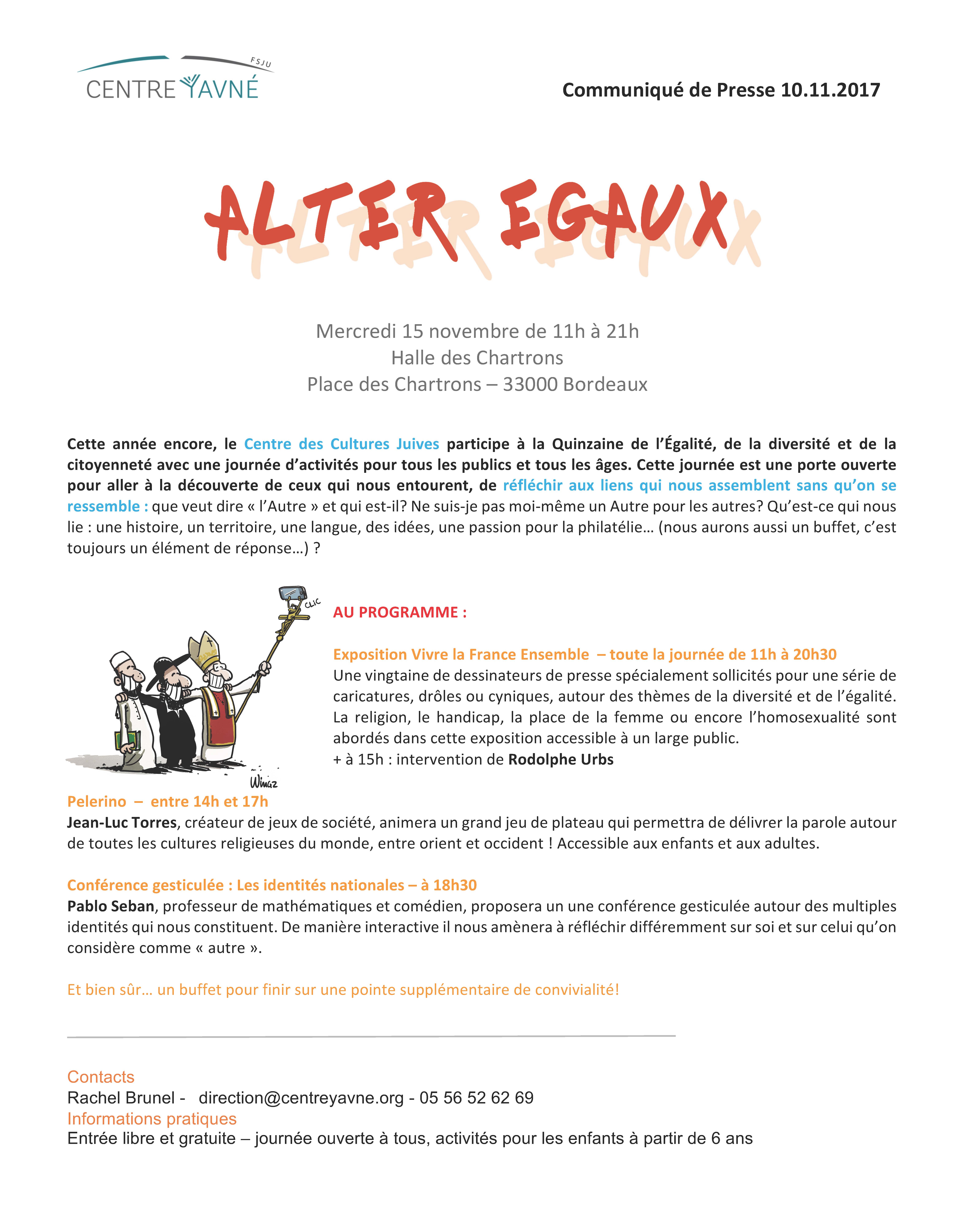 Je vous prie de trouver ci-joint le communiqué de presse pour le prochain événement du Centre des Cultures Juives (Centre Yavné), le mercredi 15 novembre à la Halle des Chartrons, dans le cadre de la Quinzaine de l’Egalité, avec exposition de dessins de presse, intervention d’Urbs, animations jeunes et conférence gesticulée avec Pablo Seban.