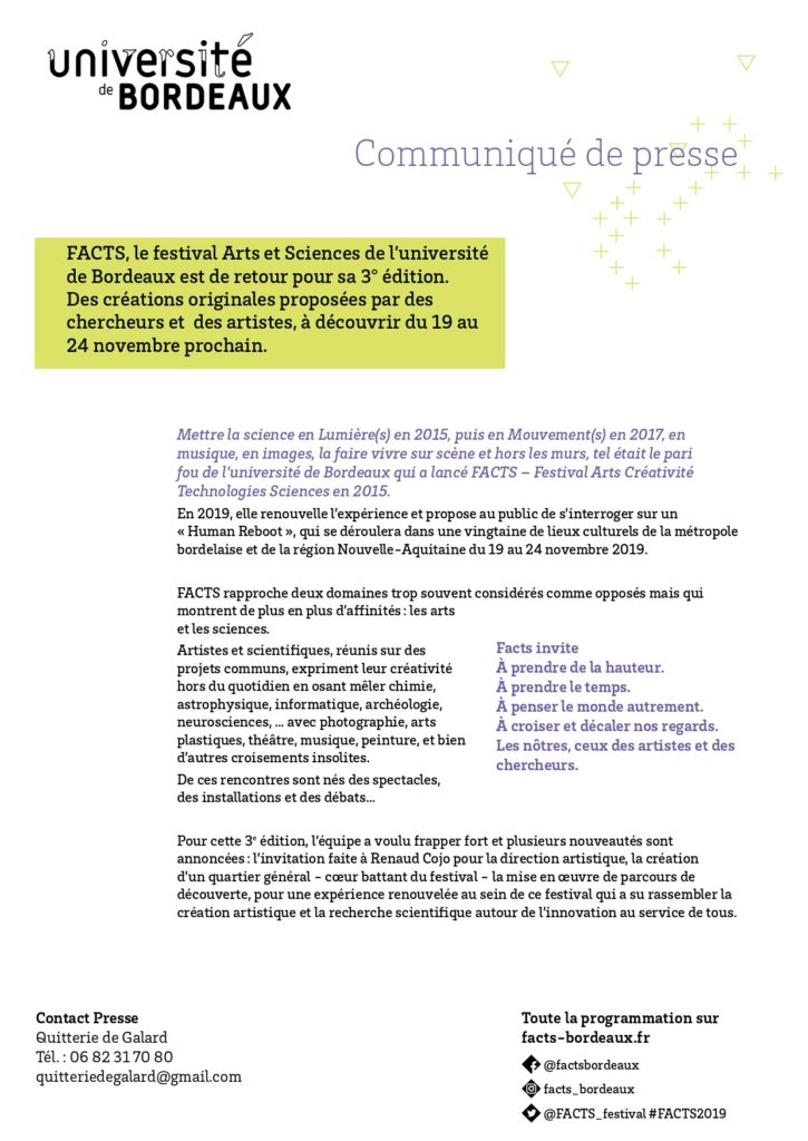 CP Festival Arts et Sciences FACTS 2019 du 19 au 24 novembre Bordeaux