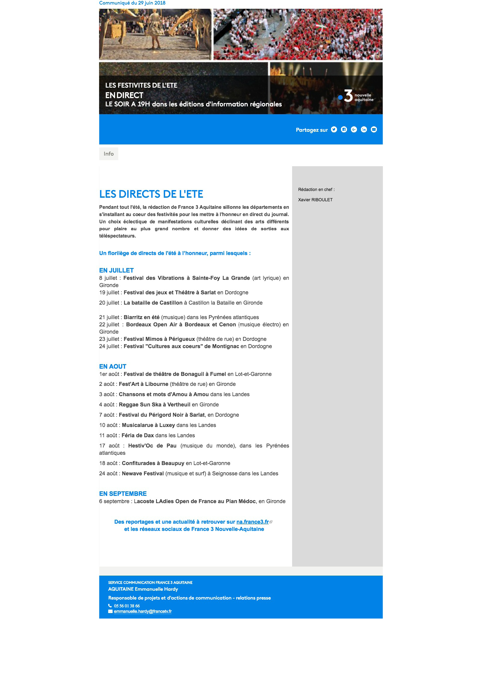Accueil > Communiqués > Festivités de l’été en direct dans le 19/20 sur France 3 Nouvelle-Aquitaine en Aquitaine