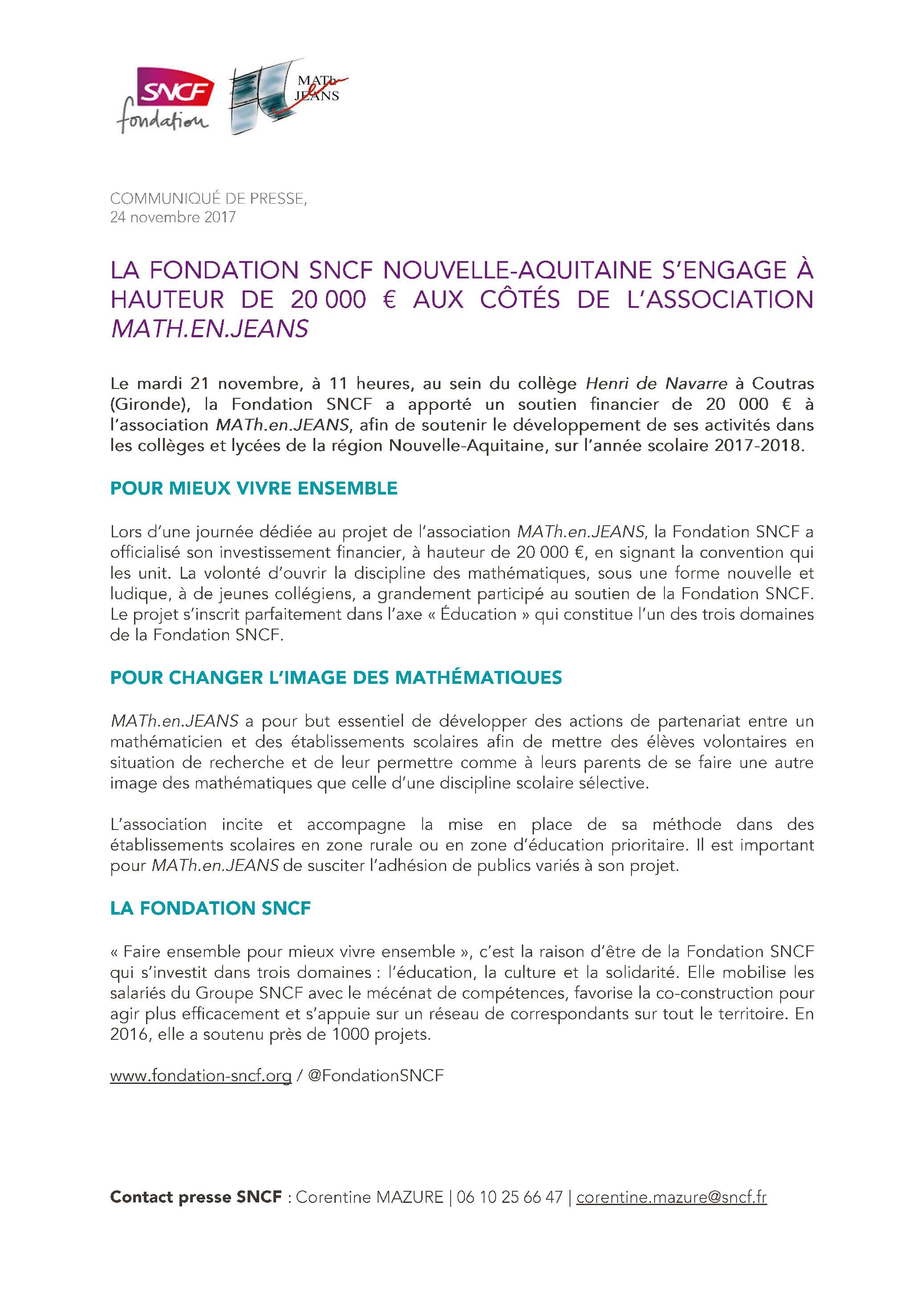 Bonjour à tous, Veuillez trouver un communiqué de presse portant sur le soutien de la Fondation SNCF Nouvelle Aquitaine à hauteur de 20 000 euros pour l’association MATh.en.JEANS. Cordialement, Corentine CORENTINE MAZURE Responsable Presse – Communication externe – Partenariats SNCF MOBILITÉS – DIRECTION RÉGIONALE NOUVELLE-AQUITAINE AGENCE COMMUNICATION RÉGIONALE 142, rue des Terres de Borde – lire la suite