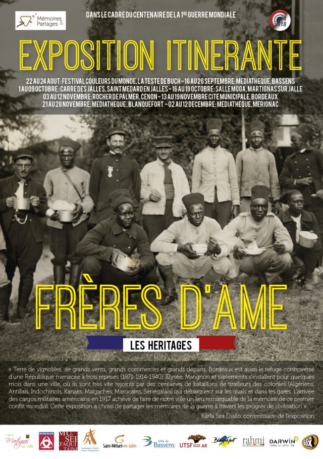 L’EXPOSITION FRERES D’AME– Conçue et réalisée par Karfa Sira Diallo, écrivain et président de la Fondation du mémorial de la traite des noirs, l’exposition Frères d’âme, héritages croisés de la grande guerre, a bénéficié du concours des Archives militaires de Pau, des Archives départementales de Gironde et des Archives municipales de Bordeaux.