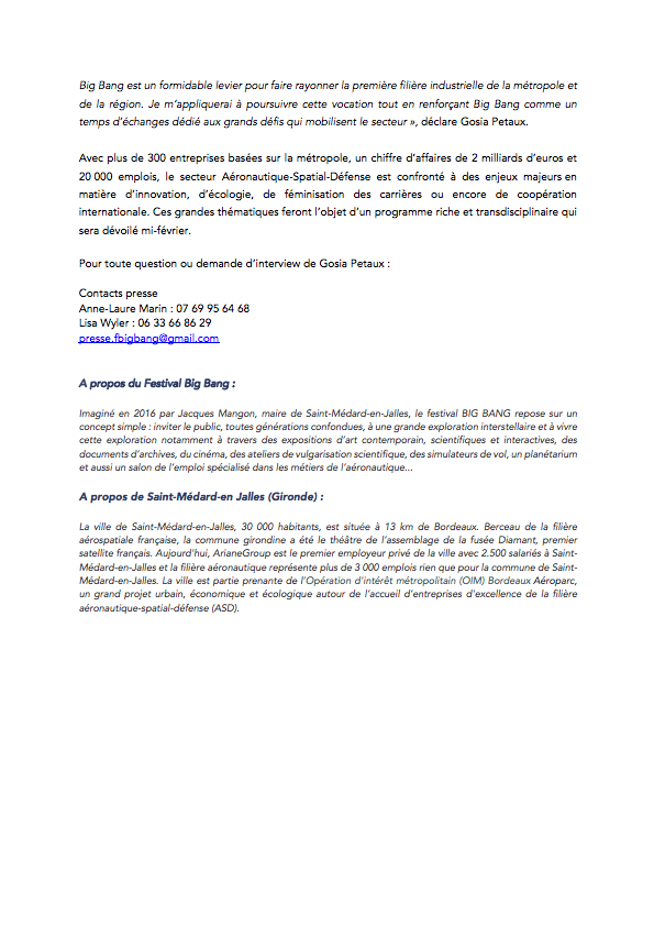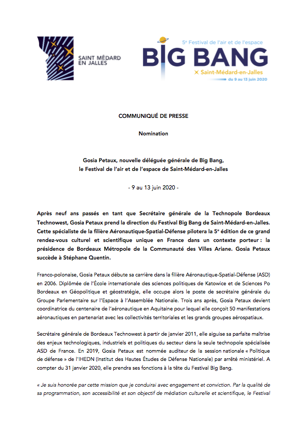 Service presse BIG BANG Festival de l’air et de l’espace presse.fbigbang@gmail.com Tél. : 07 69 95 64 68 ou 06 33 66 86 29 http://www.festival-bigbang.com/ CP en pdf : CP_Nomination_Gosia Petaux