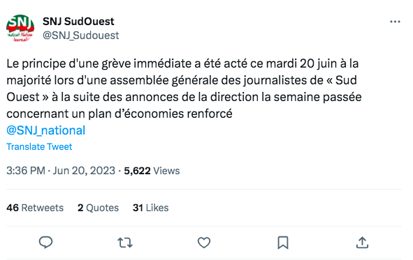 Ce mardi, lors d'une assemblée générale de la rédaction organisée par le SNJ, les journalistes de "Sud Ouest" ont décidé à la majorité de se mettre en arrêt de travail. Ce mouvement de grève éclate en réaction aux mesures d'économie présentées par le directeur général, Nicolas Sterckx, la semaine dernière lors d'une commission économique du CSE.